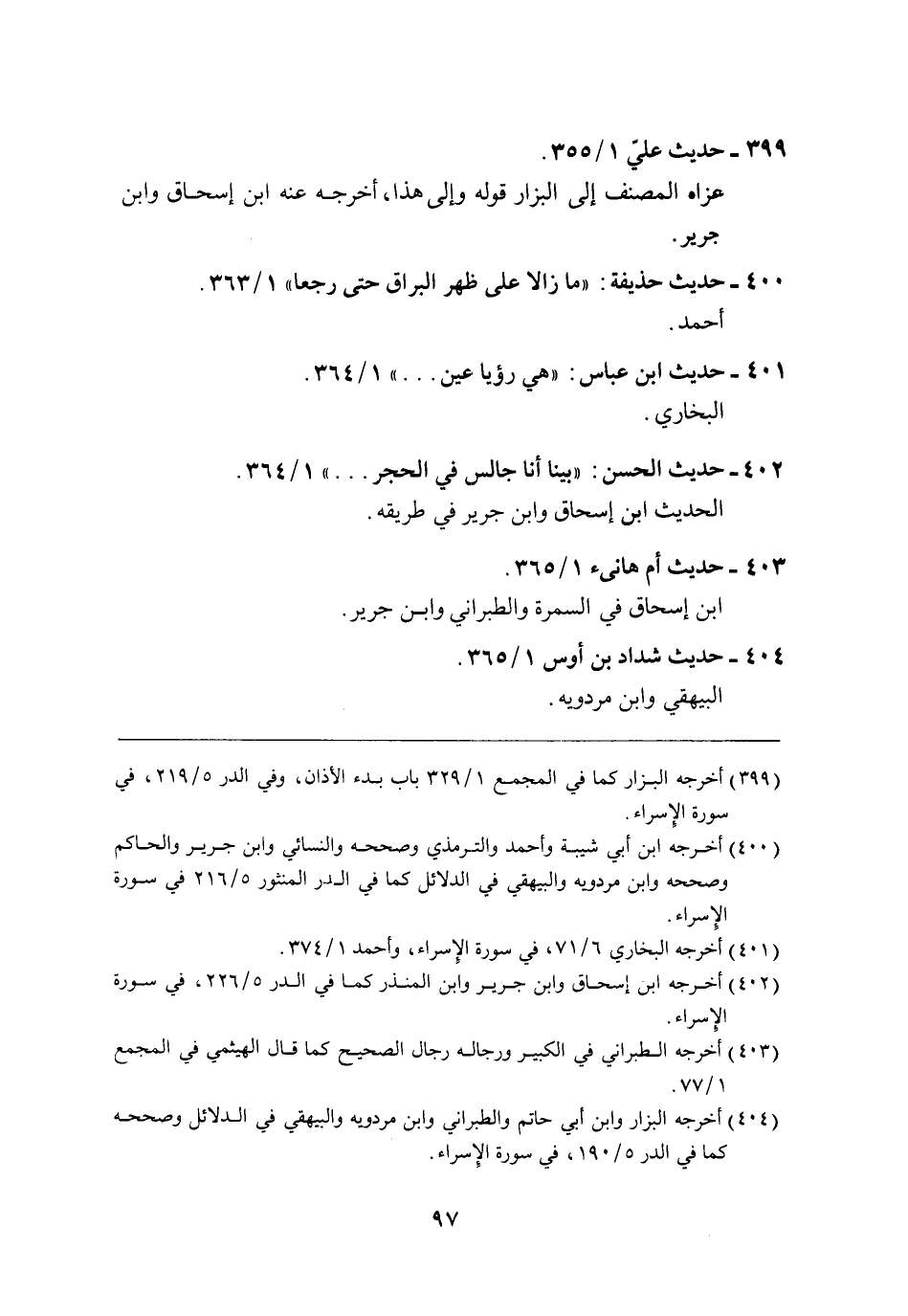 400 - حديث حذيفة: "ما زالا على ظهر البراق حتى رجعا" 1/ 363.