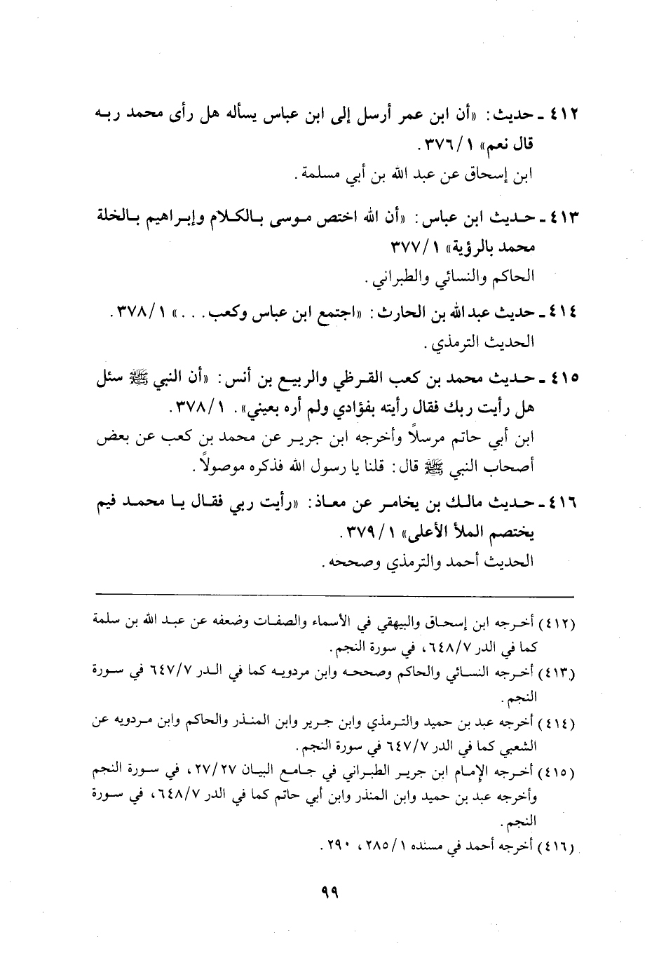 415 - حديث محمد بن كعب القرظي والربيع بن أنس: "أن النبي - صلى الله عليه وسلم - سئل هل رأيت ربك فقال رأيته بفؤادي ولم أره بعيني". 1/ 378.