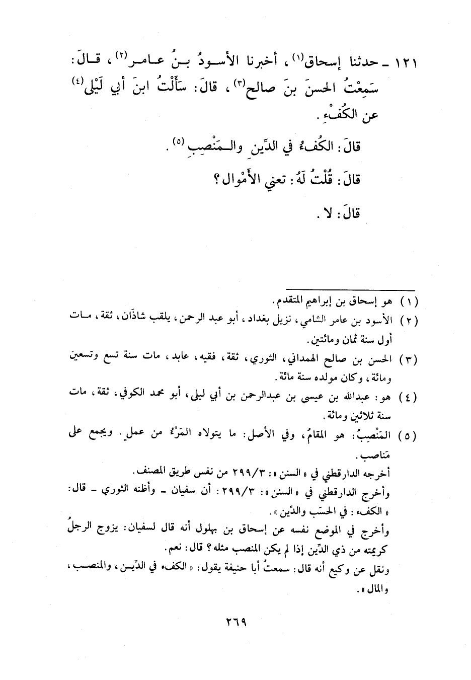 121 - حَدَّثَنَا إِسْحَاقُ، أَخْبَرَنَا الْأَسْوَدُ بْنُ عَامِرٍ، قَالَ: سَمِعْتُ الْحَسَنَ بْنَ صَالِحٍ، قَالَ: سَأَلْتُ ابْنَ أَبِي لَيْلَى عَنِ الْكُفْءِ، قَالَ: «§الْكُفْءُ فِي الدِّينِ وَالْمَنْصِبِ» قَالَ: قُلْتُ لَهُ: تَعْنِي الْأَمْوَالَ؟ قَالَ: «لَا»