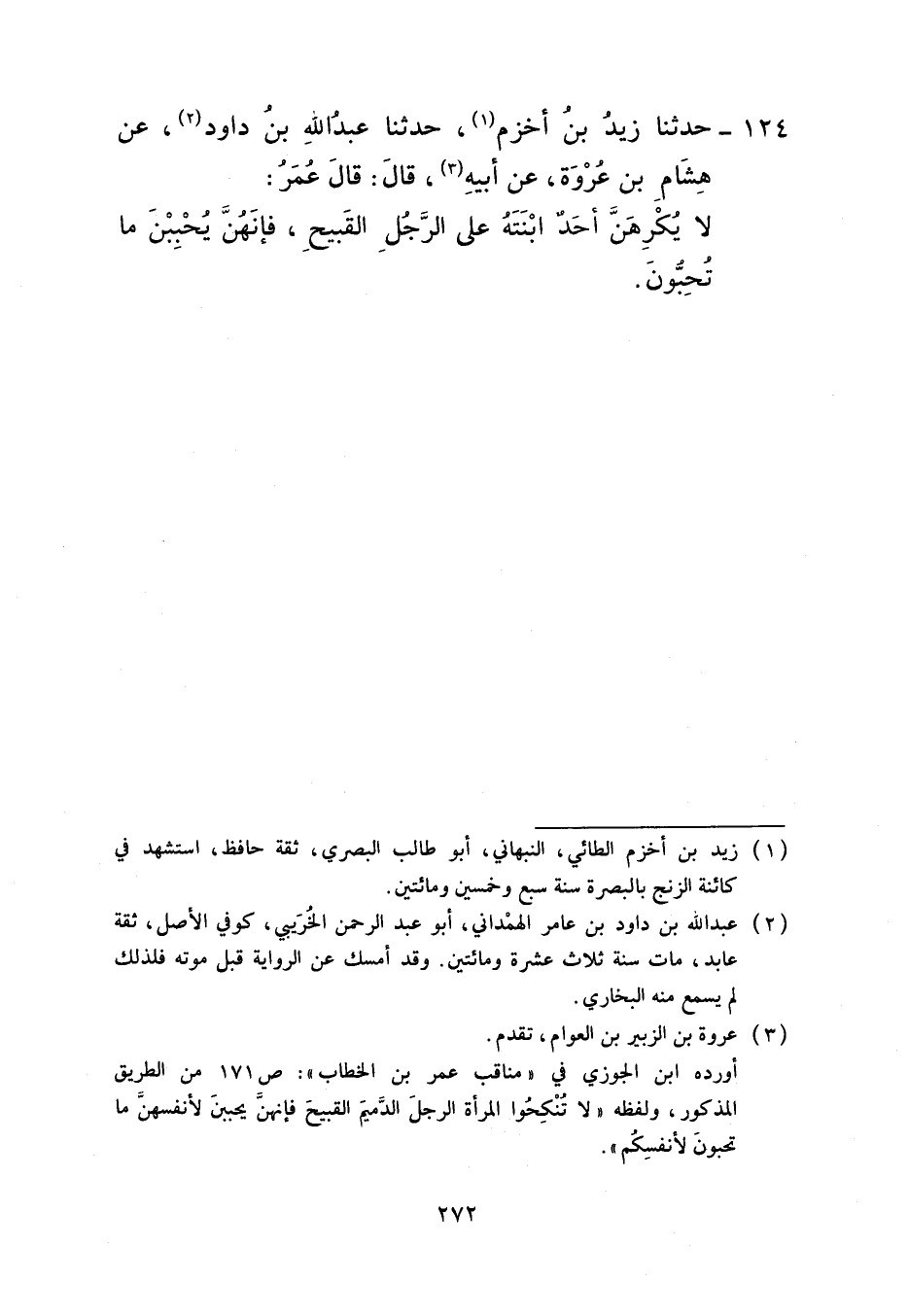 124 - حَدَّثَنَا زَيْدُ بْنُ أَخْزَمَ، حَدَّثَنَا عَبْدُ اللَّهِ بْنُ دَاوُدَ، عَنْ هِشَامِ بْنِ عُرْوَةَ، عَنْ أَبِيهِ، قَالَ: قَالَ عُمَرُ: «§لَا يُكْرِهَنَّ أَحَدٌ ابْنَتَهُ عَلَى الرَّجُلِ الْقَبِيحِ فَإِنَّهُنَّ يُحْبِبْنَ مَا تُحِبُّونَ»