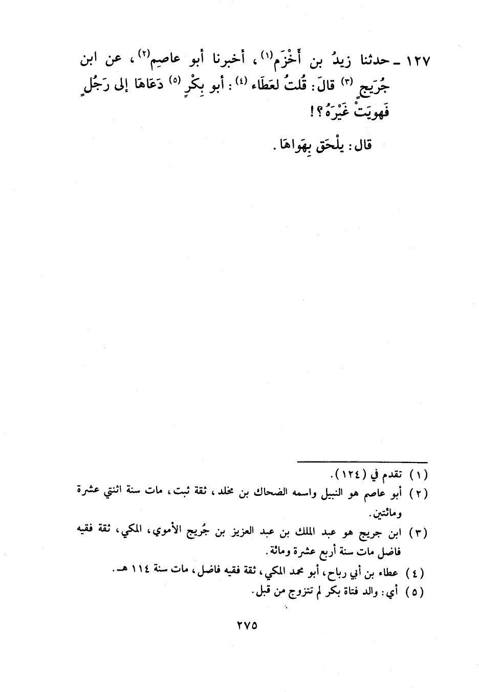 127 - حَدَّثَنَا زَيْدُ بْنُ أَخْزَمَ، أَخْبَرَنَا أَبُو عَاصِمٍ، عَنِ ابْنِ جُرَيْجٍ، قَالَ: قُلْتُ لِعَطَاءٍ: أَبُو بِكْرٍ دَعَاهَا إِلَى رَجُلٍ فَهَوِيَتْ غَيْرَهُ؟ قَالَ: «§يَلْحَقُ بِهَوَاهَا»