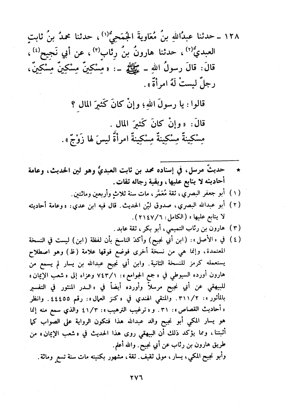 128 - حَدَّثَنَا عَبْدُ اللَّهِ بْنُ مُعَاوِيَةَ الْجُمَحِيُّ، حَدَّثَنَا مُحَمَّدُ بْنُ ثَابِتٍ الْعَبْدِيُّ، حَدَّثَنَا هَارُونُ بْنُ رِئَابٍ، عَنْ أَبِي نَجِيحٍ، قَالَ: قَالَ رَسُولُ اللَّهِ صَلَّى اللهُ عَلَيْهِ وَسَلَّمَ: «مِسْكِينٌ مِسْكِينٌ §مِسْكِينٌ رَجُلٌ لَيْسَتْ لَهُ امْرَأَةٌ» قَالُوا: يَا رَسُولَ اللَّهِ، وَإِنْ كَانَ كَثِيرَ الْمَالِ؟ قَالَ: «وَإِنْ كَانَ كَثِيرَ الْمَالِ، مِسْكِينَةٌ مِسْكِينَةٌ مِسْكِينَةٌ امْرَأَةٌ لَيْسَ لَهَا زَوْجٌ» -[277]- قَالُوا: يَا رَسُولَ اللَّهِ، وَإِنْ كَانَتْ غَنِيَّةً مُكْثِرَةً؟ قَالَ: «وَإِنْ كَانَتْ غَنِيَّةً مُكْثِرَةً»