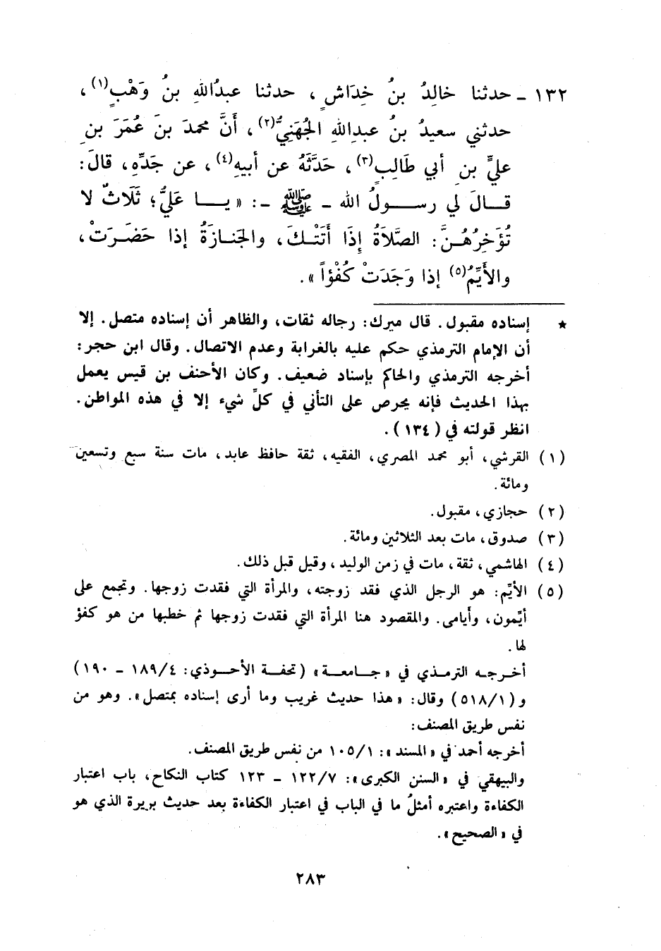 132 - حَدَّثَنَا خَالِدُ بْنُ خِدَاشٍ، حَدَّثَنَا عَبْدُ اللَّهِ بْنُ وَهْبٍ، حَدَّثَنِي سَعِيدُ بْنُ عَبْدِ اللَّهِ الْجُهَنِيُّ، أَنَّ مُحَمَّدَ بْنَ عُمَرَ بْنِ عَلِيِّ بْنِ أَبِي طَالِبٍ حَدَّثَهُ , عَنْ أَبِيهِ، عَنْ جَدِّهِ، قَالَ: قَالَ لِي رَسُولُ اللَّهِ صَلَّى اللهُ عَلَيْهِ وَسَلَّمَ: " يَا عَلِيُّ، §ثَلَاثٌ لَا تُؤَخِّرْهُنَّ: الصَّلَاةُ إِذَا أَتَتْكَ , وَالْجَنَازَةُ إِذَا حَضَرَتْ , وَالْأَيِّمُ إِذَا وَجَدَتْ كُفُؤًا "