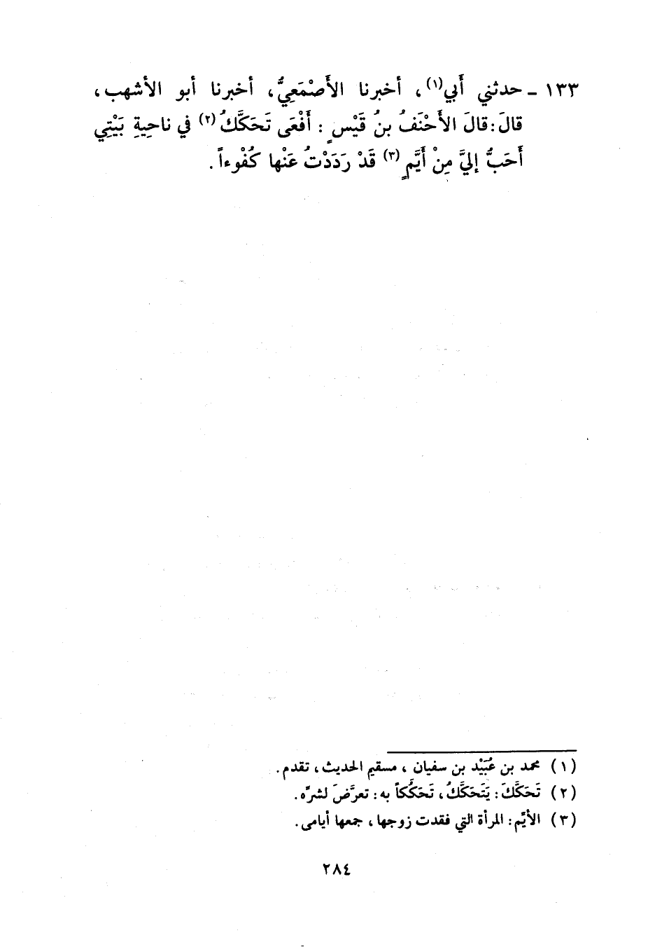 133 - حَدَّثَنَا أَبِي، أَخْبَرَنَا الْأَصْمَعِيُّ، أَخْبَرَنَا أَبُو الْأَشْهَبِ، قَالَ: قَالَ الْأَحْنَفُ بْنُ قَيْسٍ: «§أَفْعَى تُحَكِّكُ فِي نَاحِيَةِ بَيْتِي أَحَبُّ إِلَيَّ مِنْ أَيِّمٍ قَدْ رَدَدْتُ عَنْهَا كُفُوءًا»