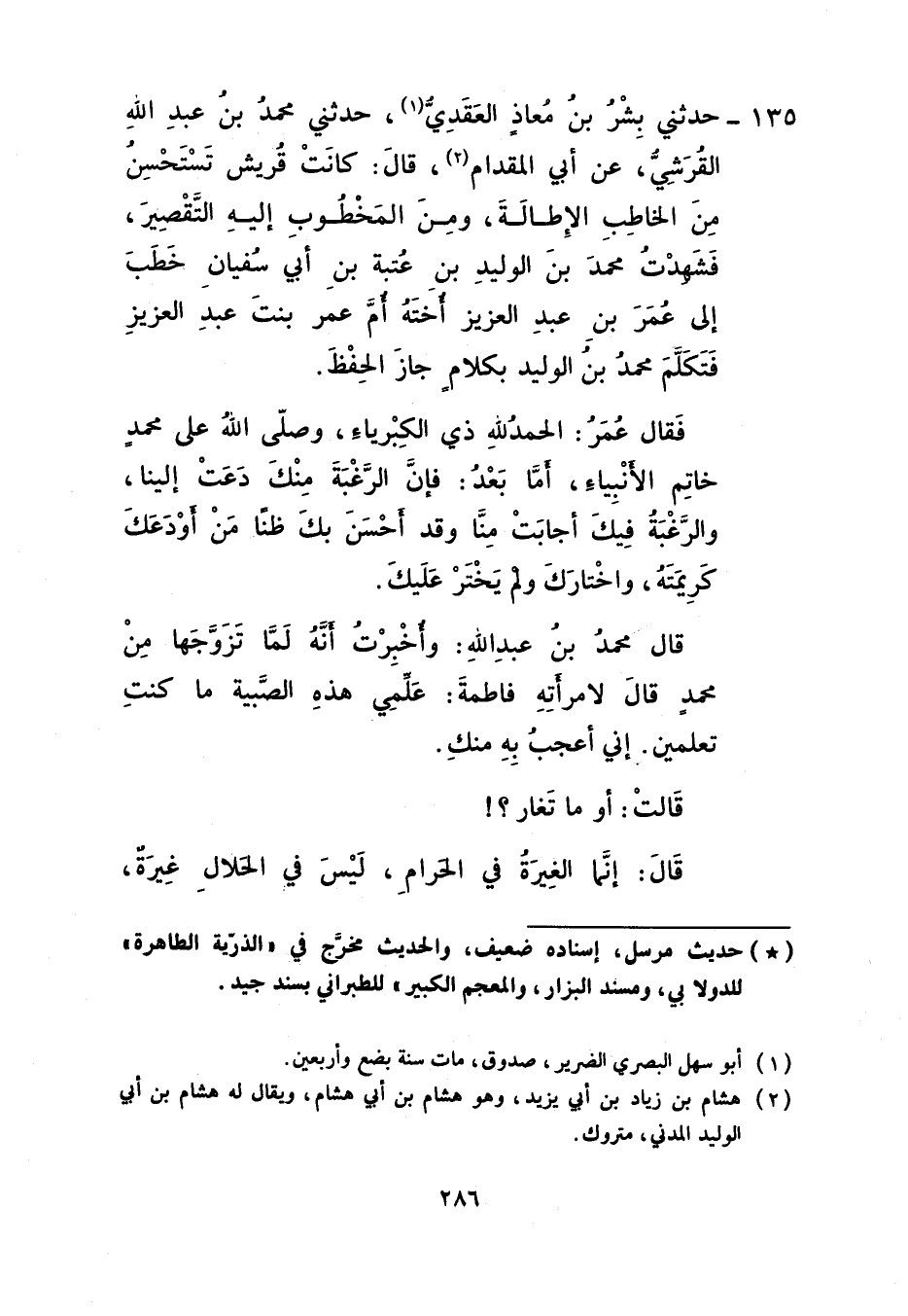 135 - حَدَّثَنِي بِشْرُ بْنُ مُعَاذٍ الْعَقَدِيُّ، حَدَّثَنِي مُحَمَّدُ بْنُ عَبْدِ اللَّهِ الْقُرَشِيُّ، عَنْ أَبِي الْمِقْدَامِ، قَالَ: كَانَتْ قُرَيْشٌ تَسْتَحْسِنُ مِنَ الْخَاطِبِ الْإِطَالَةَ وَمِنَ الْمَخْطُوبِ إِلَيْهِ التَّقْصِيرَ، فَشَهِدْتُ مُحَمَّدَ بْنَ الْوَلِيدِ بْنِ عُتْبَةَ بْنِ أَبِي سُفْيَانَ خَطَبَ إِلَى عُمَرَ بْنِ عَبْدِ الْعَزِيزِ أُخْتَهُ أُمَّ عُمَرَ بِنْتَ عَبْدِ الْعَزِيزِ فَتَكَلَّمَ مُحَمَّدُ بْنُ الْوَلِيدِ بِكَلَامٍ جَازَ الْحِفْظَ فَقَالَ عُمَرُ: الْحَمْدُ لِلَّهِ ذِي الْكِبْرِيَاءِ، وَصَلَّى اللَّهُ عَلَى مُحَمَّدٍ خَاتَمِ الْأَنْبِيَاءِ؛ أَمَّا بَعْدُ فَإِنَّ الرَّغْبَةَ مِنْكَ دَعَتْ إِلَيْنَا وَالرَّغْبَةَ فِيكَ أَجَابَتْ مِنَّا وَقَدْ أَحْسَنَ بِكَ ظَنًّا مَنْ أَوْدَعَكَ كَرِيمَتَهُ وَاخْتَارَكَ وَلَمْ يَخْتَرْ عَلَيْكَ " قَالَ مُحَمَّدُ بْنُ عَبْدِ اللَّهِ: وَأُخْبِرْتُ أَنَّهُ لَمَّا تَزَوَّجَهَا مِنْ مُحَمَّدٍ قَالَ لِامْرَأَتِهِ فَاطِمَةَ: عِلِّمِي هَذِهِ الصِّبْيَةَ مَا كُنْتِ تَعْلَمِينَ إِنِّي أَعْجَبُ بِهِ مِنْكِ قَالَتْ أَوَ مَا تَغَارُ؟ قَالَ: إِنَّمَا الْغِيرَةُ فِي الْحَرَامِ لَيْسَ فِي الْحَلَالِ غِيرَةٌ -[287]- بَعْدَ قَوْلِ رَسُولِ اللَّهِ صَلَّى اللهُ عَلَيْهِ وَسَلَّمَ لِعَلِيٍّ وَفَاطِمَةَ: «§لَا تَعْجَلَا حَتَّى أَدْخُلَ عَلَيْكُمَا»
