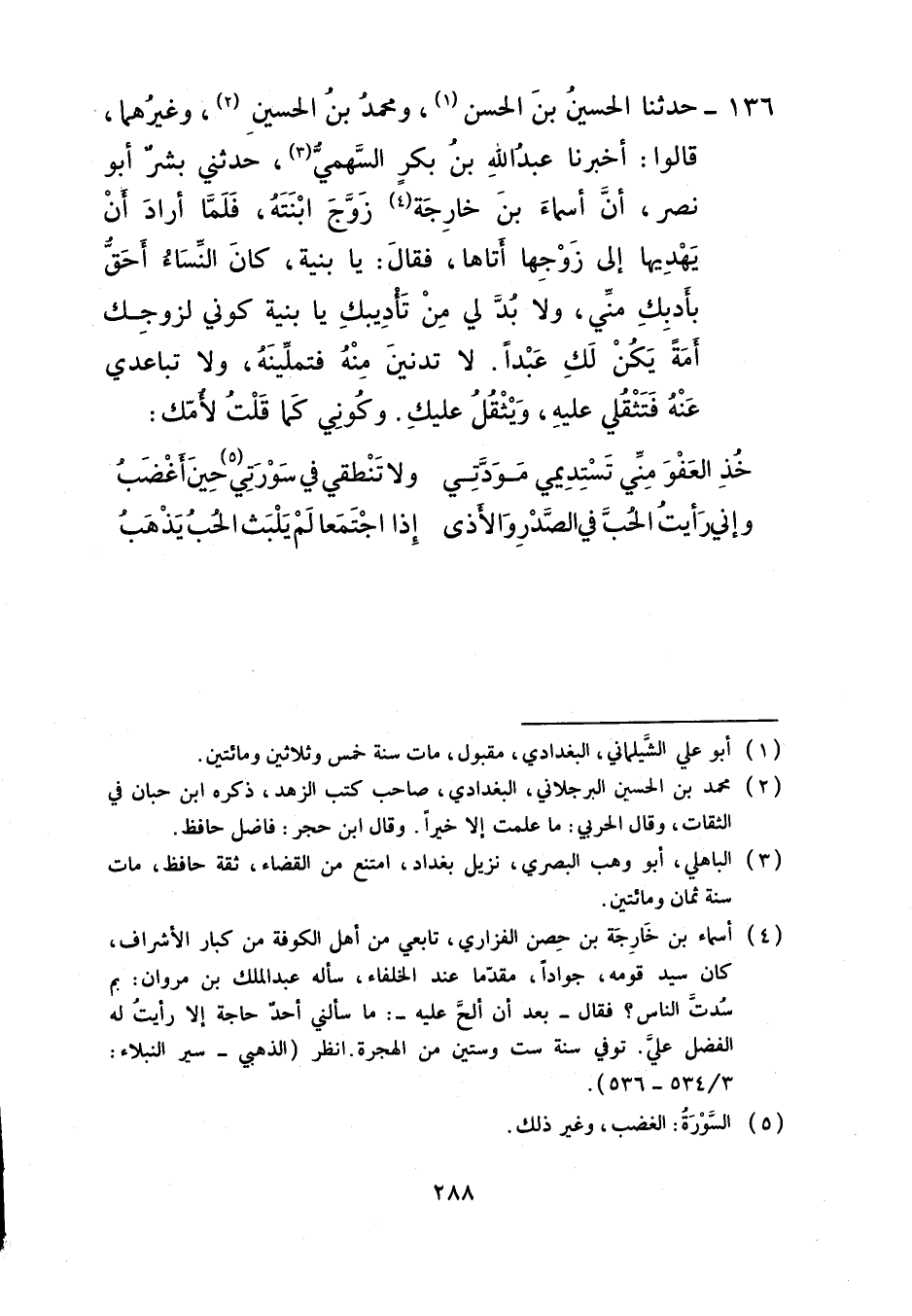 136 - حَدَّثَنَا الْحُسَيْنُ بْنُ الْحَسَنِ، وَمُحَمَّدُ بْنُ الْحُسَيْنِ، وَغَيْرُهُمَا، قَالُوا: أَخْبَرَنَا عَبْدُ اللَّهِ بْنُ بَكْرٍ السَّهْمِيُّ، حَدَّثَنِي بِشْرٌ أَبُو نَصْرٍ، أَنَّ أَسْمَاءَ بْنَ خَارِجَةَ زَوَّجَ ابْنَتَهُ فَلَمَّا أَرَادَ أَنْ يُهْدِيَهَا إِلَى زَوْجِهَا أَتَاهَا فَقَالَ: " يَا بُنَيَّةَ كَانَ النِّسَاءَ أَحَقَّ بِأَدَبِكِ مِنِّي وَلَا بُدَّ لِي مِنْ تَأْدِيبِكِ يَا بُنَيَّةُ §كُونِي لِزَوْجِكِ أَمَةً يَكُنْ لَكِ عَبْدًا لَا تَدْنِينَ مِنْهُ فَتَمَلِّينَهُ وَلَا تَبَاعَدِي عَنْهُ فَتَثْقُلِي عَلَيْهِ وَيَثْقُلُ عَلَيْكِ، وَكُونِي كَمَا قُلْتُ لِأُمِّكِ: