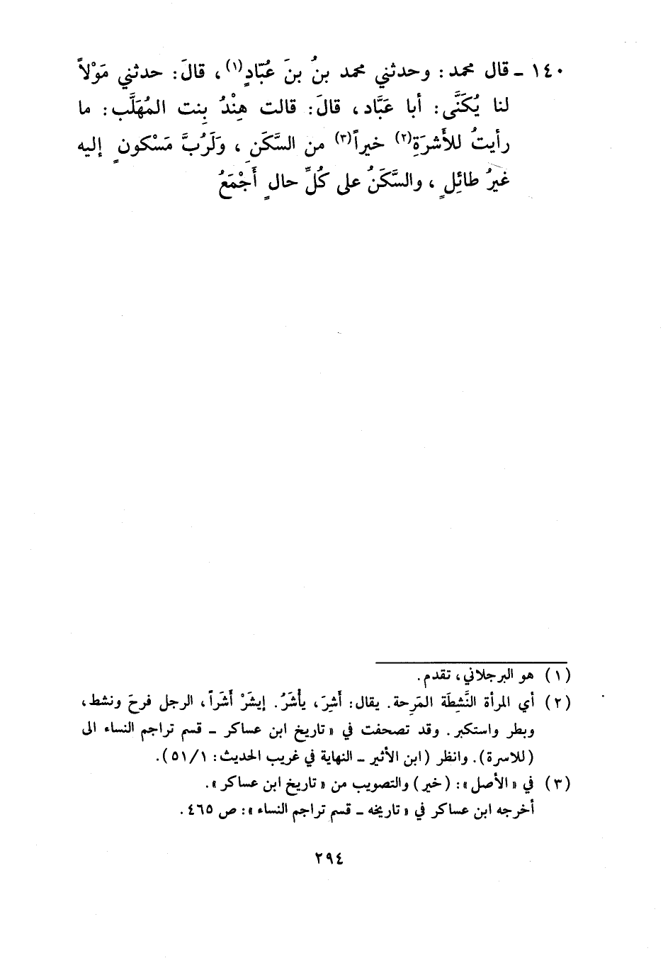 140 - قَالَ مُحَمَّدٌ: وَحَدَّثَنِي مُحَمَّدُ بْنُ عَبَّادٍ، قَالَ: حَدَّثَنِي مَوْلًى لَنَا يُكَنَّى أَبَا عَبَّادٍ قَالَ: قَالَتْ هِنْدُ بِنْتُ الْمُهَلَّبِ: «§مَا رَأَيْتُ لِلْأَشِرَةِ خَيْرًا مِنَ السَّكَنِ وَلَرُبَّ مَسْكُونٍ إِلَيْهِ غَيْرُ طَائِلٍ وَالسَّكَنُ عَلَى كُلِّ حَالٍ أَجْمَعُ»