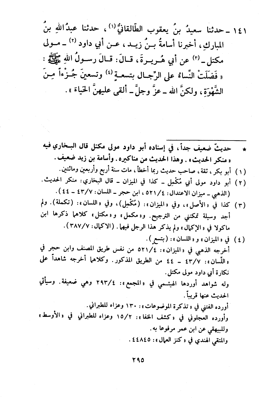 141 - حَدَّثَنَا سَعِيدُ بْنُ يَعْقُوبَ الطَّالْقَانِيُّ، حَدَّثَنَا عَبْدُ اللَّهِ بْنُ الْمُبَارَكِ، أَخْبَرَنَا أُسَامَةُ بْنُ زَيْدٍ، عَنْ أَبِي دَاوُدَ مَوْلَى مِكْتَلٍ، عَنْ أَبِي هُرَيْرَةَ , قَالَ رَسُولُ اللَّهِ صَلَّى اللهُ عَلَيْهِ وَسَلَّمَ: «§فُضِّلَتِ النِّسَاءُ عَلَى الرِّجَالِ بِتِسْعَةٍ وَتِسْعِينَ جُزْءًا مِنَ الشَّهْوَةِ وَلَكِنَّ اللَّهَ عَزَّ وَجَلَّ أَلْقَى عَلَيْهِنَّ الْحَيَاءَ»