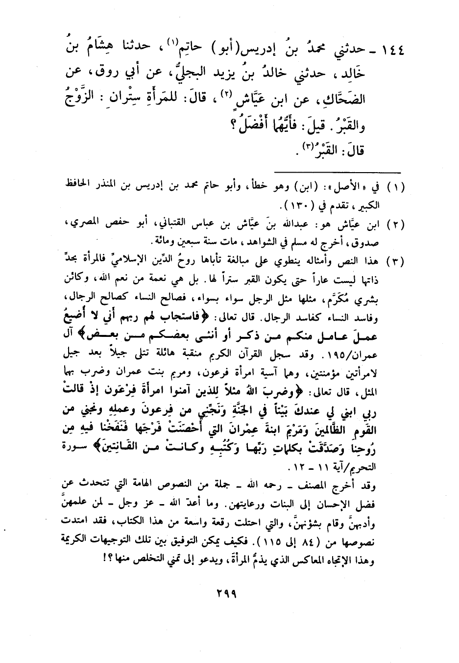 144 - حَدَّثَنِي مُحَمَّدُ بْنُ إِدْرِيسَ أَبُو حَاتِمٍ، ثنا هِشَامُ بْنُ خَالِدٍ حَدَّثَنِي خَالِدُ بْنُ يَزِيدَ الْبَجَلِيُّ، عَنْ أَبِي رَوْقٍ، عَنْ الضَّحَّاكِ، عَنْ ابْنِ عَبَّاسٍ، قَالَ: «§لِلْمَرْأَةِ سِتْرَانِ الزَّوْجُ وَالْقَبْرُ» قِيلَ: فَأَيُّهُمَا أَفْضَلُ؟ قَالَ: «الْقَبْرُ»