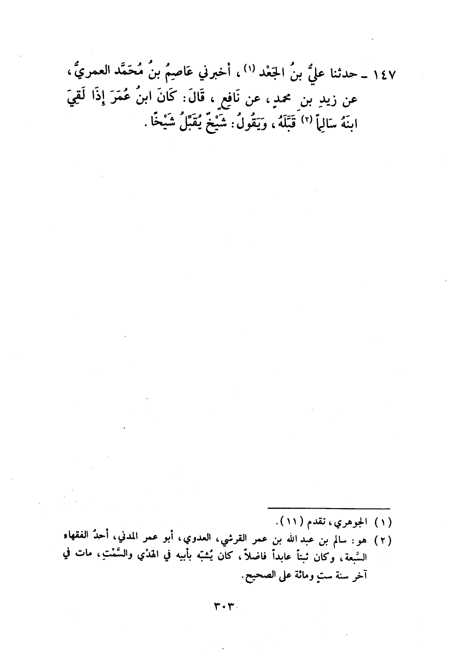147 - حَدَّثَنَا عَلِيُّ بْنُ الْجَعْدِ، أَخْبَرَنِي عَاصِمُ بْنُ مُحَمَّدٍ الْعُمَرِيُّ، عَنْ زَيْدِ بْنِ مُحَمَّدٍ، عَنْ نَافِعٍ، قَالَ: كَانَ ابْنُ عُمَرَ إِذَا لَقِيَ ابْنَهُ سَالِمًا قَبَّلَهُ وَيَقُولُ: «§شَيْخٌ يُقَبِّلُ شَيْخًا»