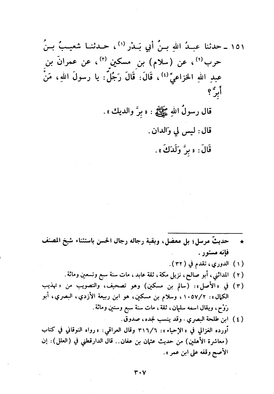 151 - حَدَّثَنَا عَبْدُ اللَّهِ بْنُ أَبِي بَدْرٍ، حَدَّثَنَا شُعَيْبُ بْنُ حَرْبٍ، عَنْ سَلَامِ بْنِ مِسْكِينٍ، عَنْ عِمْرَانَ بْنِ عَبْدِ اللَّهِ الْخُزَاعِيِّ، قَالَ: قَالَ رَجُلٌ: يَا رَسُولَ اللَّهِ، مَنْ أَبَرُّ؟ قَالَ رَسُولُ اللَّهِ صَلَّى اللهُ عَلَيْهِ وَسَلَّمَ: «§بِرَّ وَالِدَيْكَ» قَالَ: لَيْسَ لِي وَالِدَانِ قَالَ: «بِرَّ وَلَدَكَ»