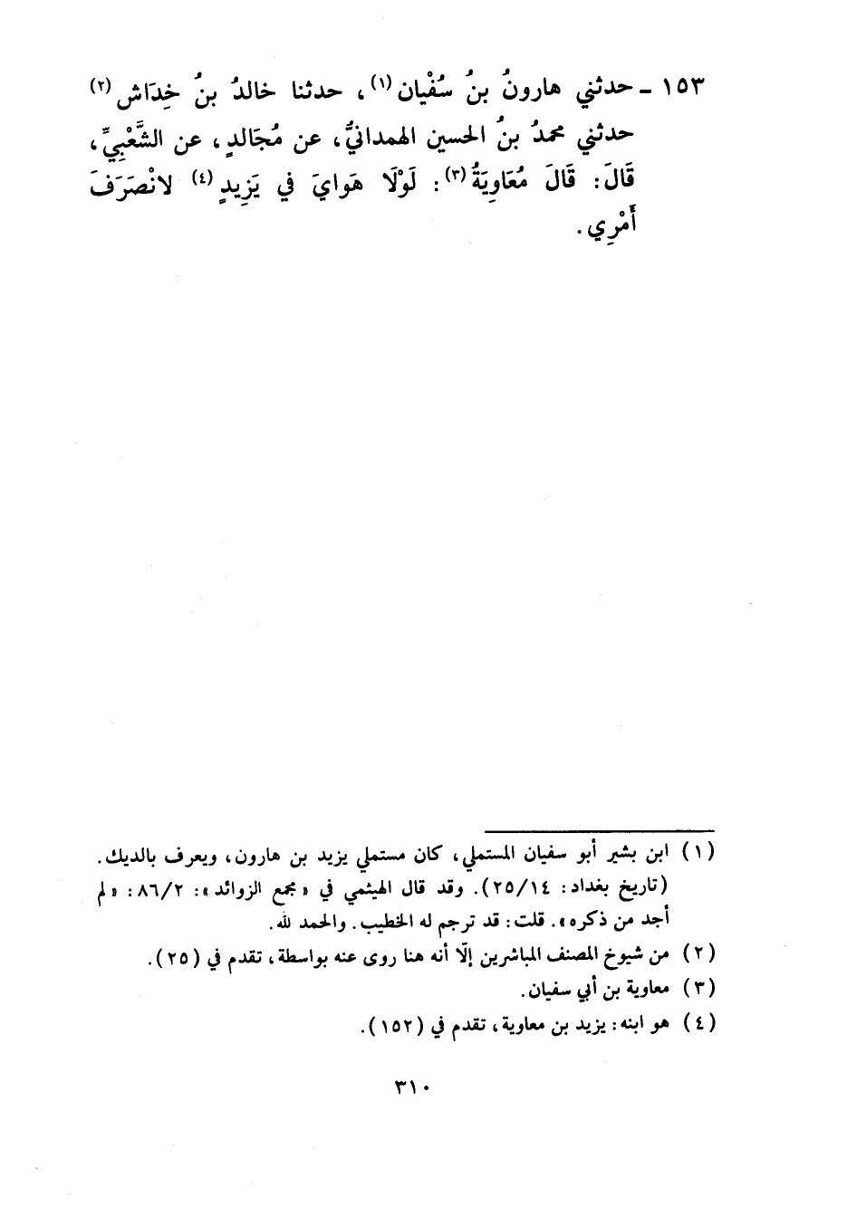 153 - حَدَّثَنِي هَارُونُ بْنُ سُفْيَانَ، حَدَّثَنَا خَالِدُ بْنُ خِدَاشٍ، حَدَّثَنِي مُحَمَّدُ بْنُ الْحُسَيْنِ الْهَمْدَانِيُّ، عَنْ مُجَالِدٍ، عَنِ الشَّعْبِيِّ قَالَ: قَالَ مُعَاوِيَةُ: «§لَوْلَا هَوَايَ فِي يَزِيدَ لَانْصَرَفَ أَمْرِي»