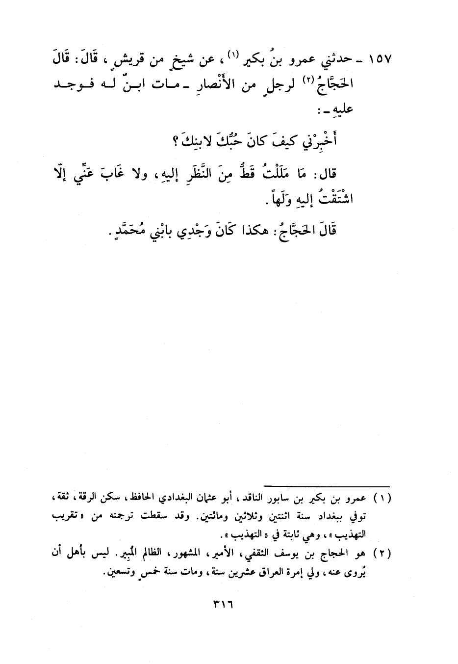 157 - حَدَّثَنِي عَمْرُو بْنُ بُكَيْرٍ، عَنْ شَيْخٍ مِنْ قُرَيْشٍ قَالَ: قَالَ الْحَجَّاجُ لِرَجُلٍ مِنَ الْأَنْصَارِ مَاتَ ابْنٌ لَهُ فَوَجِدَ عَلَيْهِ: «أَخْبِرْنِي §كَيْفَ كَانَ حُبُّكَ لِابْنِكَ؟» قَالَ: مَا مَلِلْتُ قَطُّ مِنَ النَّظَرِ إِلَيْهِ وَلَا غَابَ عَنِّي إِلَّا اشْتَقْتُ إِلَيْهِ وَلَهًا قَالَ الْحَجَّاجُ: «هَكَذَا كَانَ وَجْدِي بِابْنِي مُحَمَّدٍ»