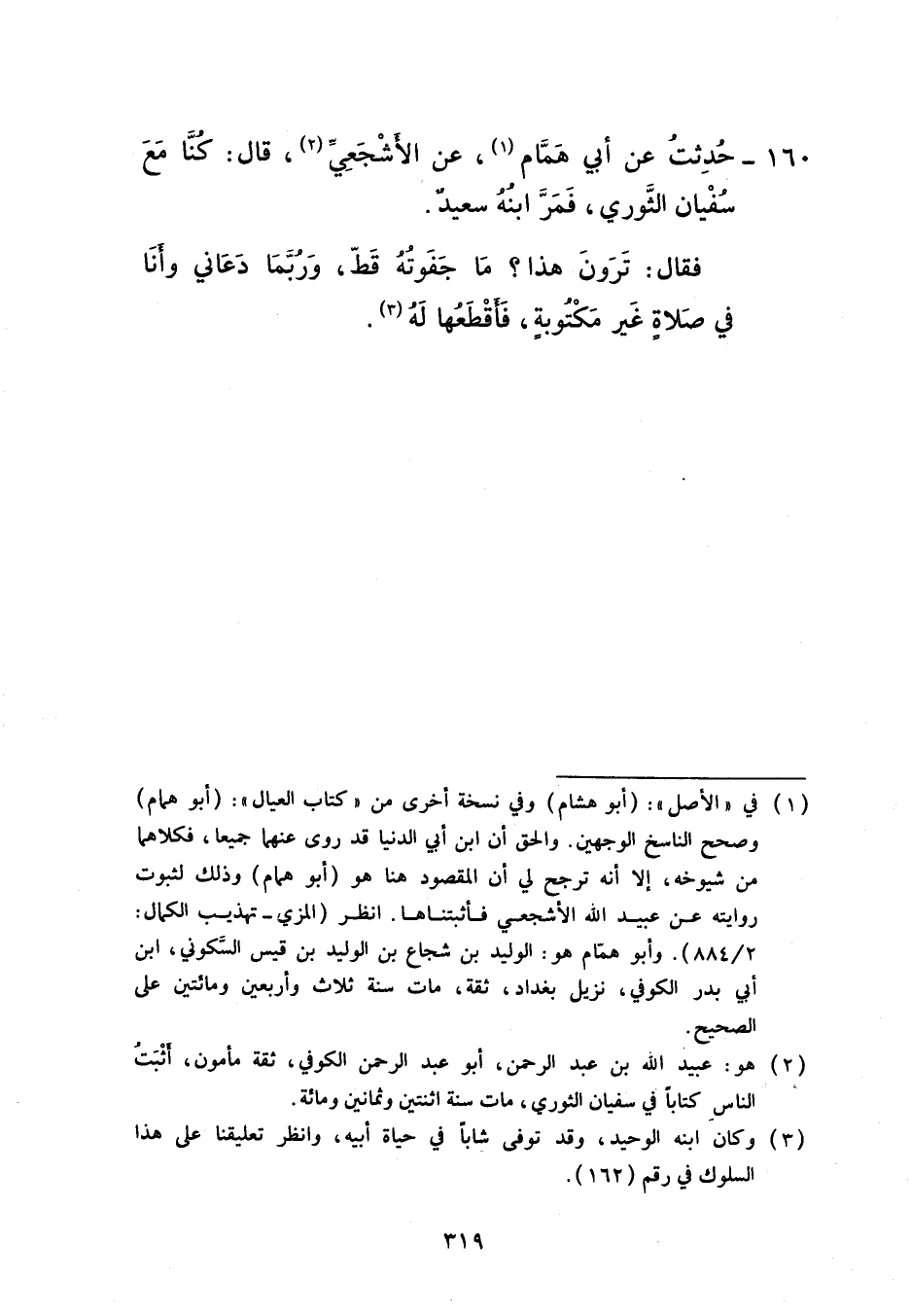 160 - حُدِّثْتُ عَنْ أَبِي هَمَّامٍ، عَنِ الْأَشْجَعِيِّ، قَالَ: كُنَّا مَعَ سُفْيَانَ الثَّوْرِيِّ فَمَرَّ ابْنُهُ سَعِيدٌ فَقَالَ: «تَرَوْنَ هَذَا §مَا جَفَوْتُهُ قَطُّ وَرُبَّمَا دَعَانِي وَأَنَا فِي صَلَاةٍ غَيْرِ مَكْتُوبَةٍ فَأَقْطَعُهَا لَهُ»