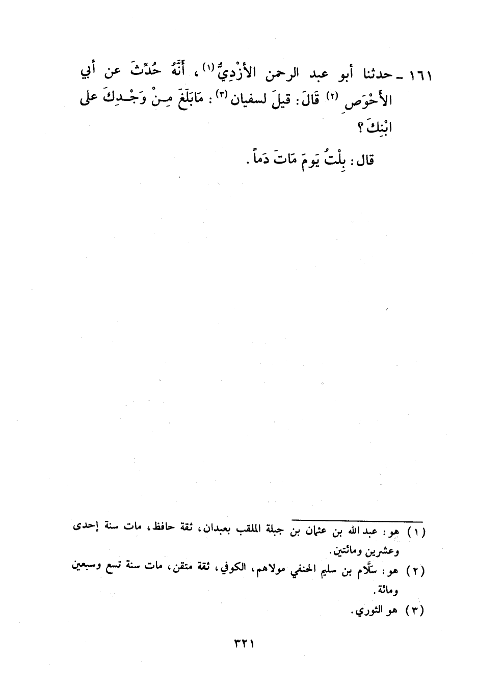 161 - حَدَّثَنَا أَبُو عَبْدِ الرَّحْمَنِ الْأَزْدِيُّ، أَنَّهُ حُدِّثَ عَنْ أَبِي الْأَحْوَصِ، قَالَ: قِيلَ لِسُفْيَانَ: مَا بَلَغَ مِنْ وَجْدِكَ عَلَى ابْنِكَ؟ قَالَ: «§بُلْتُ يَوْمَ مَاتَ دَمًا»