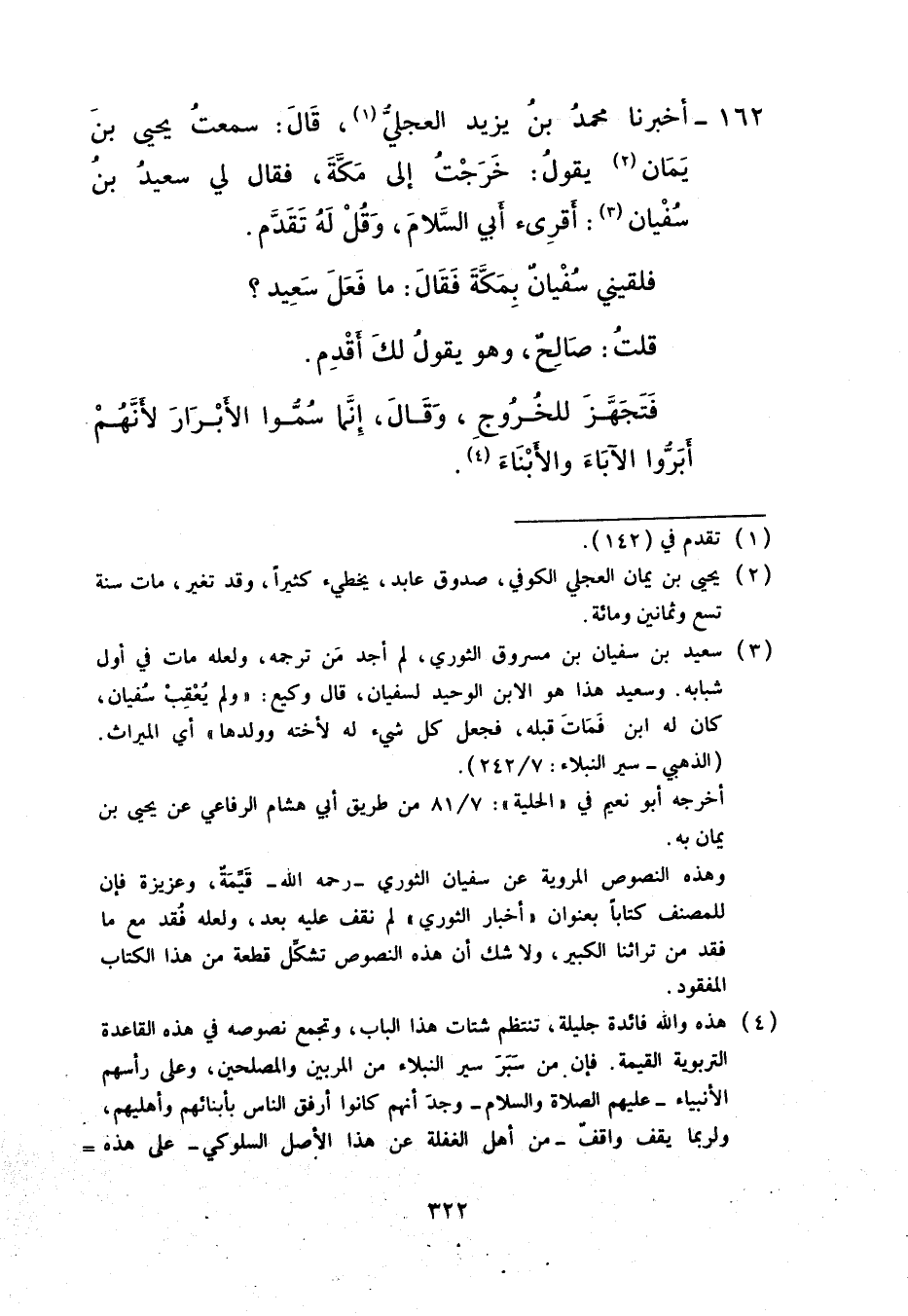 162 - أَخْبَرَنَا مُحَمَّدُ بْنُ يَزِيدَ الْعِجْلِيُّ، قَالَ: سَمِعْتُ يَحْيَى بْنَ يَمَانٍ، يَقُولُ: خَرَجْتُ إِلَى مَكَّةَ فَقَالَ لِي سَعِيدُ بْنُ سُفْيَانَ: أَقْرِئْ أَبِي السَّلَامَ وَقُلْ لَهُ: تَقَدَّمْ، فَلَقِيَنِي سُفْيَانُ بِمَكَّةَ فَقَالَ: مَا فَعَلَ سَعِيدٌ؟ قُلْتُ: صَالِحٌ، وَهُوَ يَقُولُ لَكَ: أَقْدِمْ فَتَجَهَّزَ لِلْخُرُوجِ وَقَالَ: «إِنَّمَا §سُمُّوا الْأَبْرَارَ؛ لِأَنَّهُمْ أَبَرُّوا الْآبَاءَ وَالْأَبْنَاءَ»