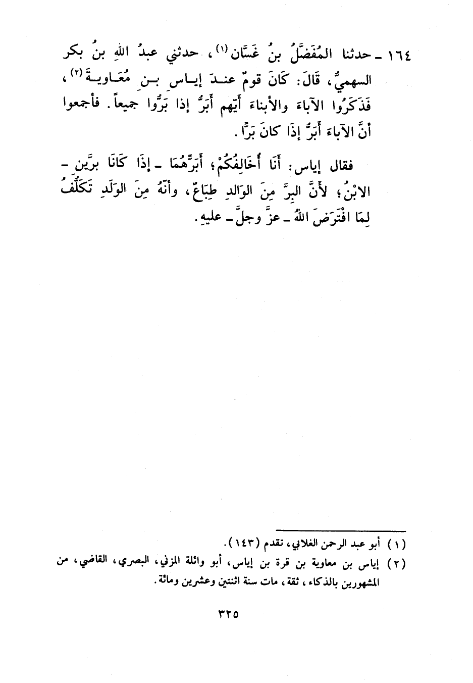 164 - حَدَّثَنَا الْمُفَضَّلُ بْنُ غَسَّانَ، حَدَّثَنِي عَبْدُ اللَّهِ بْنُ بَكْرٍ السَّهْمِيُّ، قَالَ: كَانَ قَوْمٌ عِنْدَ إِيَاسِ بْنِ مُعَاوِيَةَ فَذَكَرُوا الْآبَاءَ وَالْأَبْنَاءَ أَيُّهُمْ أَبَرُّ إِذَا بَرُّوا جَمِيعًا؟ فَأَجْمَعُوا أَنَّ الْآبَاءَ أَبَرُّ إِذَا كَانَ بَرًّا , فَقَالَ إِيَاسٌ: «أَنَا أُخَالِفُكُمْ، §أَبَرُّهُمَا إِذَا كَانَا بَرَّيْنِ الِابْنُ؛ لِأَنَّ الْبِرَّ مِنَ الْوَالِدِ طِبَاعٌ وَأَنَّهُ مِنَ الْوَلَدِ تَكَلُّفٌ لِمَا افْتَرَضَ اللَّهُ عَزَّ وَجَلَّ عَلَيْهِ»