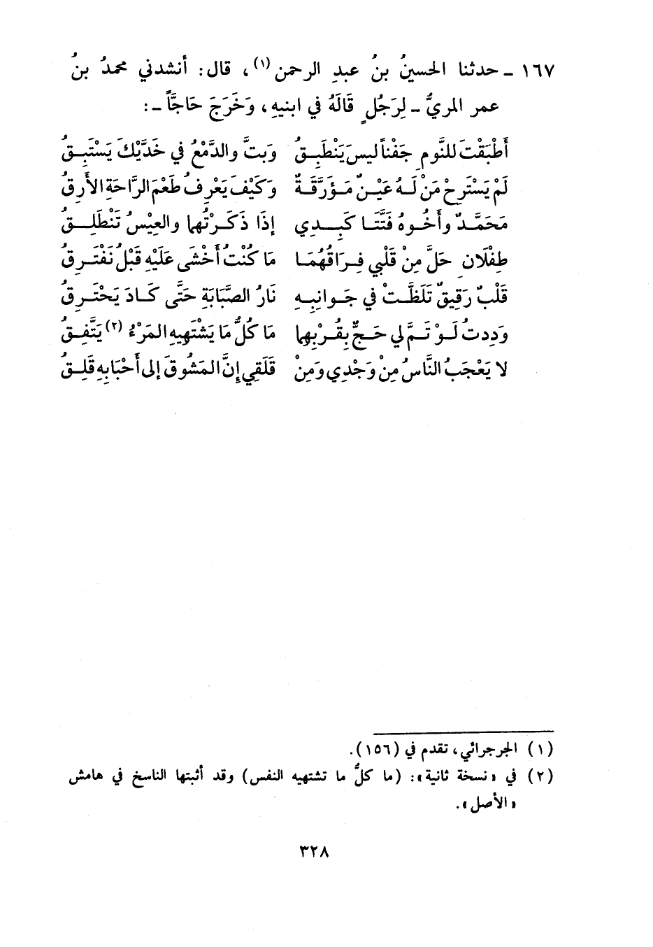 167 - حَدَّثَنَا الْحُسَيْنُ بْنُ عَبْدِ الرَّحْمَنِ، قَالَ: أَنْشَدَنِي مُحَمَّدُ بْنُ عُمَرَ الْمُرِّيُّ لِرَجُلٍ قَالَهُ فِي ابْنَيْهِ وَخَرَجَ حَاجًّا: