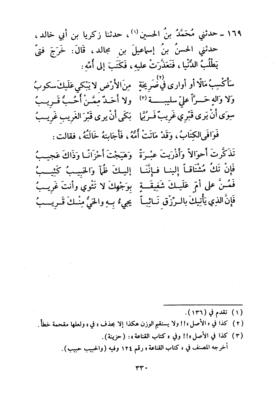 169 - حَدَّثَنِي مُحَمَّدُ بْنُ الْحُسَيْنِ، حَدَّثَنَا زَكَرِيَّا بْنُ أَبِي خَالِدٍ، حَدَّثَنِي الْحَسَنُ بْنُ إِسْمَاعِيلَ بْنِ مُجَالِدٍ، قَالَ: خَرَجَ فَتًى يَطْلُبُ الدُّنْيَا فَتَعَذَّرَتْ عَلَيْهِ فَكَتَبَ إِلَى أُمِّهِ: