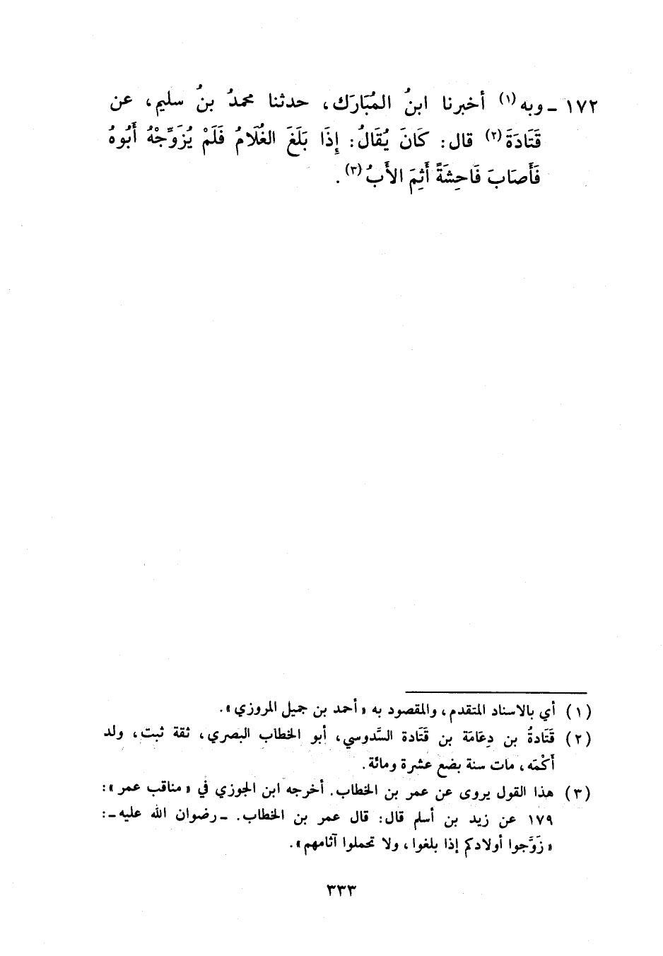 172 - وَبِهِ أَخْبَرَنَا ابْنُ الْمُبَارَكِ، حَدَّثَنَا مُحَمَّدُ بْنُ سُلَيْمٍ، عَنْ قَتَادَةَ، قَالَ: كَانَ يُقَالُ: «§إِذَا بَلَغَ الْغُلَامُ فَلَمْ يُزَوِّجْهُ أَبُوهُ فَأَصَابَ فَاحِشَةً، أَثِمَ الْأَبُ»