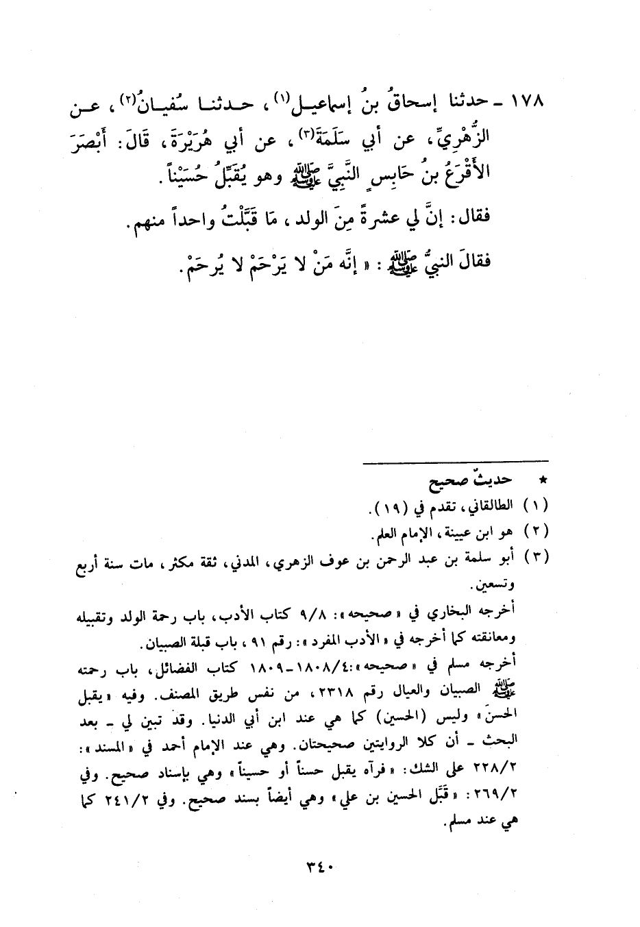 178 - حَدَّثَنَا إِسْحَاقُ بْنُ إِسْمَاعِيلَ، حَدَّثَنَا سُفْيَانُ، عَنِ الزُّهْرِيِّ، عَنْ أَبِي سَلَمَةَ، عَنْ أَبِي هُرَيْرَةَ، قَالَ: أَبْصَرَ الْأَقْرَعُ بْنُ حَابِسٍ النَّبِيَّ صَلَّى اللهُ عَلَيْهِ وَسَلَّمَ وَهُوَ يُقَبِّلُ حُسَيْنًا فَقَالَ: إِنَّ لِي عَشَرَةً مِنَ الْوَلَدِ مَا قَبَّلْتُ وَاحِدًا مِنْهُمْ فَقَالَ النَّبِيُّ صَلَّى اللهُ عَلَيْهِ وَسَلَّمَ: «إِنَّهُ مَنْ §لَا يَرْحَمُ لَا يُرْحَمُ»