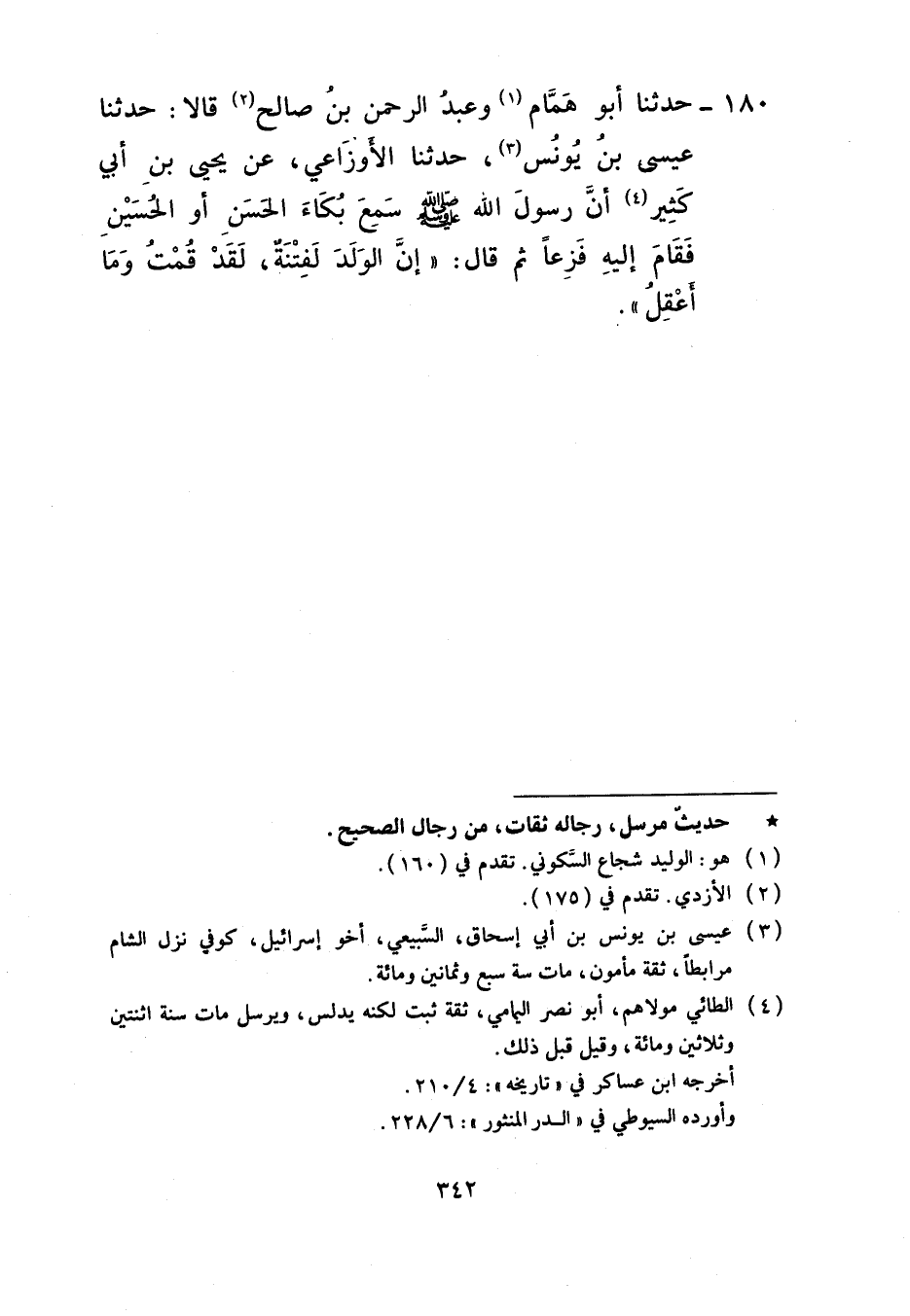 180 - حَدَّثَنَا أَبُو هَمَّامٍ، وَعَبْدُ الرَّحْمَنِ بْنُ صَالِحٍ، قَالَا حَدَّثَنَا عِيسَى بْنُ يُونُسَ، حَدَّثَنَا الْأَوْزَاعِيُّ، عَنْ يَحْيَى بْنِ أَبِي كَثِيرٍ، أَنَّ رَسُولَ اللَّهِ صَلَّى اللهُ عَلَيْهِ وَسَلَّمَ سَمِعَ بُكَاءَ الْحَسَنِ أَوِ الْحُسَيْنِ فَقَامَ إِلَيْهِ فَزِعًا ثُمَّ قَالَ: «إِنَّ §الْوَلَدَ لَفِتْنَةٌ لَقَدْ قُمْتُ وَمَا أَعْقِلُ»