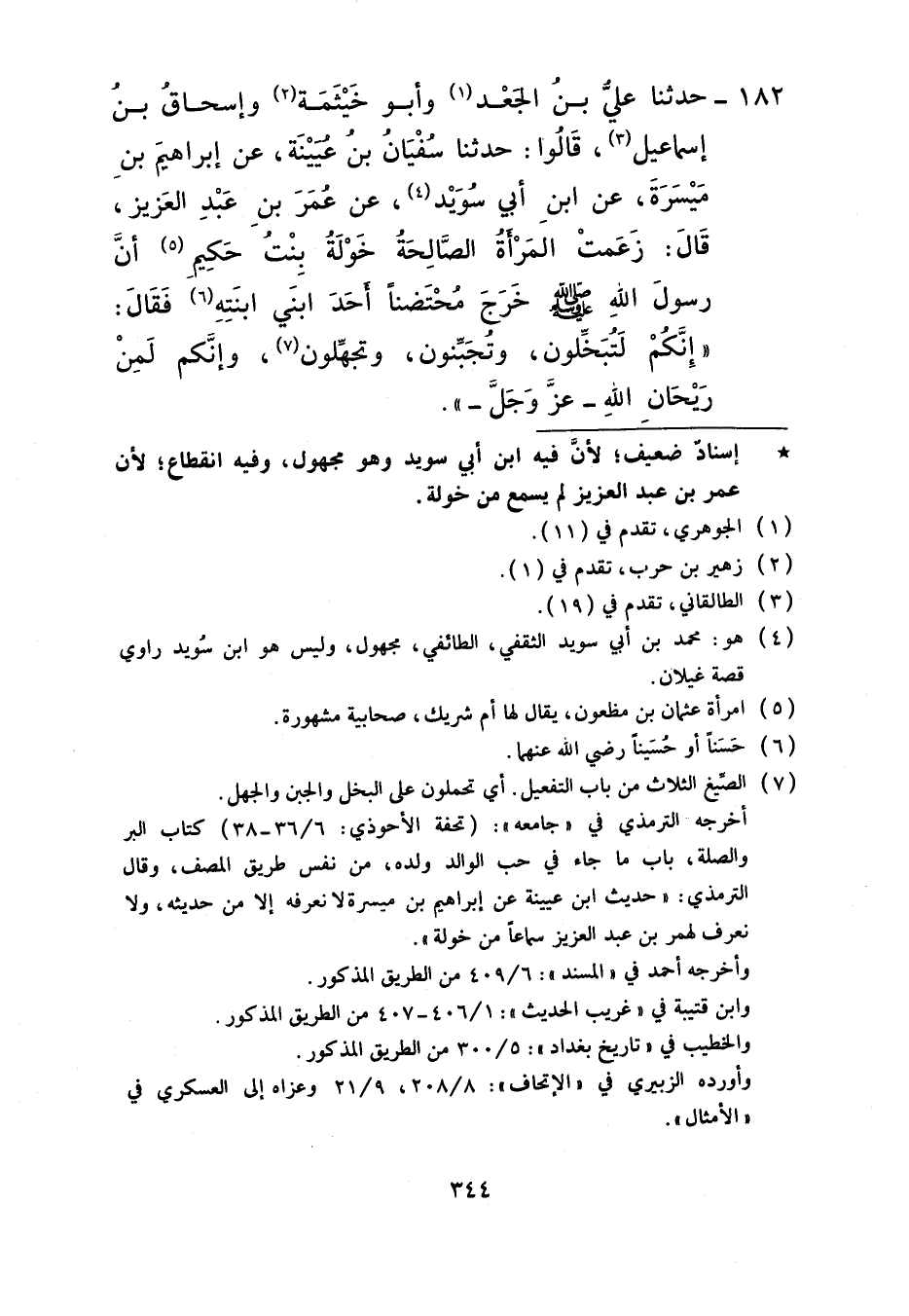 182 - حَدَّثَنَا عَلِيُّ بْنُ الْجَعْدِ، وَأَبُو خَيْثَمَةَ، وَإِسْحَاقُ بْنُ إِسْمَاعِيلَ قَالُوا: حَدَّثَنَا سُفْيَانُ بْنُ عُيَيْنَةَ، عَنْ إِبْرَاهِيمَ بْنِ مَيْسَرَةَ، عَنِ ابْنِ أَبِي سُوَيْدٍ، عَنْ عُمَرَ بْنِ عَبْدِ الْعَزِيزِ، قَالَ: زَعَمَتِ الْمَرْأَةُ الصَّالِحَةُ خَوْلَةُ بِنْتُ حَكِيمٍ أَنَّ رَسُولَ اللَّهِ صَلَّى اللهُ عَلَيْهِ وَسَلَّمَ خَرَجَ مُحْتَضِنًا أَحَدَ ابْنَيِ ابْنَتِهِ فَقَالَ: «§إِنَّكُمْ لَتُبَخِّلُونَ وَتُجَبِّنُونَ وَتُجَهِّلُونَ وَإِنَّكُمْ لَمِنْ رَيْحَانِ اللَّهِ عَزَّ وَجَلَّ»