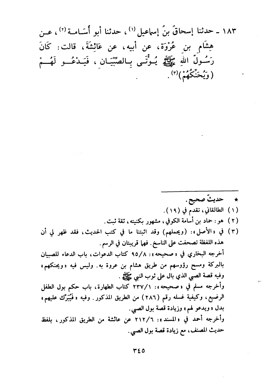 183 - حَدَّثَنَا إِسْحَاقُ بْنُ إِسْمَاعِيلَ، حَدَّثَنَا أَبُو أُسَامَةَ، عَنْ هِشَامِ بْنِ عُرْوَةَ، عَنْ أَبِيهِ، عَنْ عَائِشَةَ، قَالَتْ: «كَانَ رَسُولُ اللَّهِ صَلَّى اللهُ عَلَيْهِ وَسَلَّمَ §يُؤْتَى بِالصِّبْيَانِ فَيَدْعُو لَهُمْ وَيُحَنِّكُهُمْ»