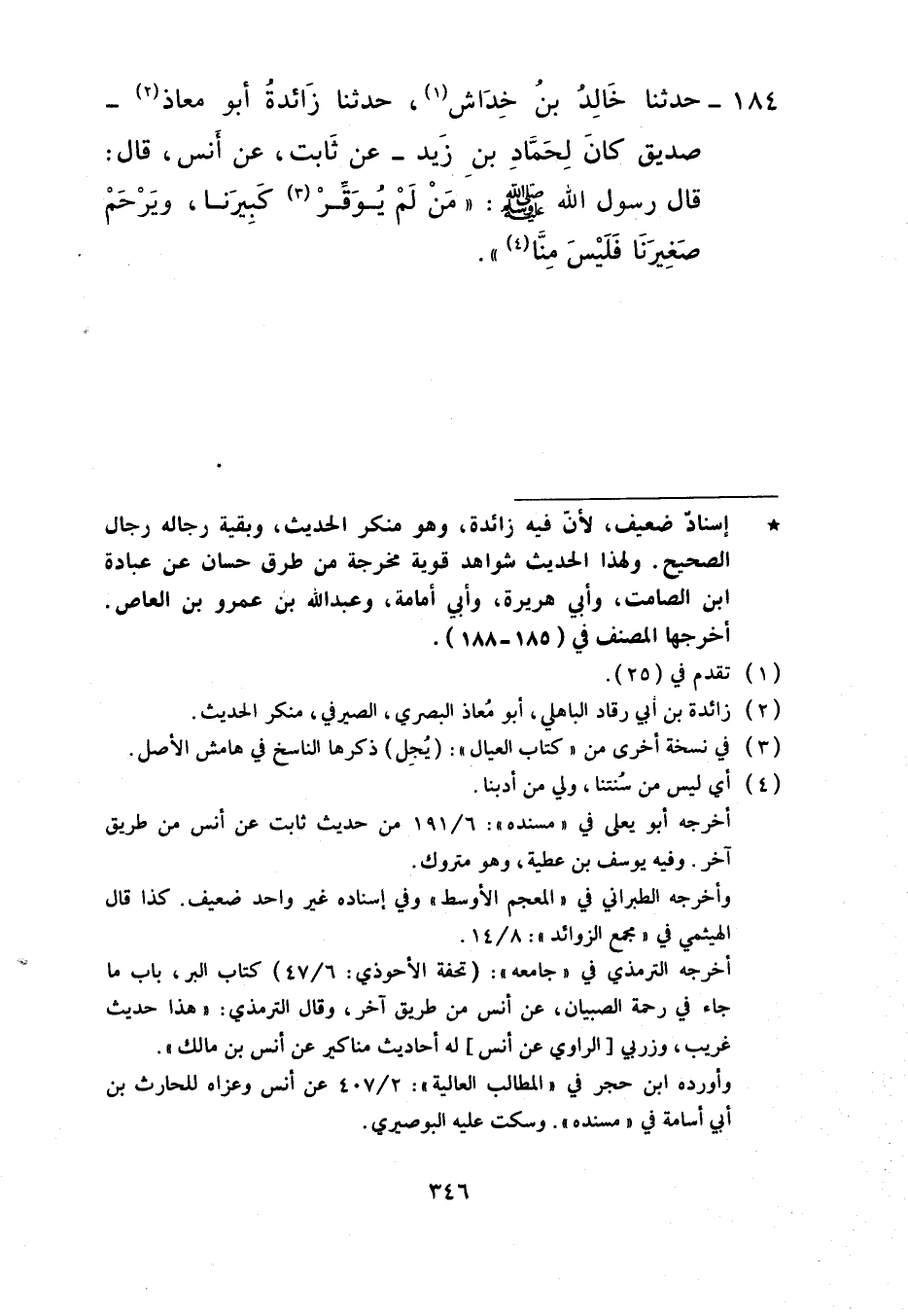 184 - حَدَّثَنَا خَالِدُ بْنُ خِدَاشٍ، حَدَّثَنَا زَائِدَةُ أَبُو مُعَاذٍ صَدِيقٌ كَانَ لِحَمَّادِ بْنِ زَيْدٍ، عَنْ ثَابِتٍ، عَنْ أَنَسٍ، قَالَ: قَالَ رَسُولُ اللَّهِ صَلَّى اللهُ عَلَيْهِ وَسَلَّمَ: «§مَنْ لَمْ يُوَقِّرْ كَبِيرَنَا وَيَرْحَمْ صَغِيرَنَا فَلَيْسَ مِنَّا»