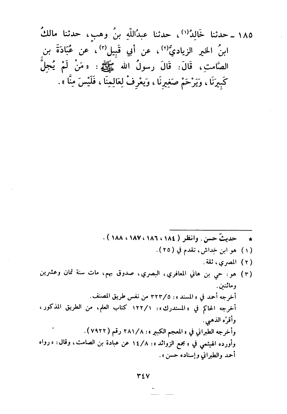 185 - حَدَّثَنَا خَالِدٌ، حَدَّثَنَا عَبْدُ اللَّهِ بْنُ وَهْبٍ، حَدَّثَنَا مَالِكُ بْنُ الْخَيْرِ الزِّيَادِيُّ، عَنْ أَبِي قَبِيلٍ، عَنْ عُبَادَةَ بْنِ الصَّامِتِ، قَالَ: قَالَ رَسُولُ اللَّهِ صَلَّى اللهُ عَلَيْهِ وَسَلَّمَ: «§مَنْ لَمْ يُجِلَّ كَبِيرَنَا وَيَرْحَمْ صَغِيرَنَا وَيَعْرِفْ لِعَالِمِنَا فَلَيْسَ مِنَّا»
