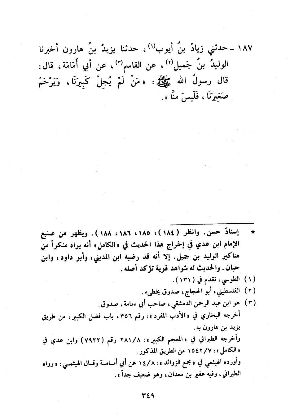 187 - حَدَّثَنِي زِيَادُ بْنُ أَيُّوبَ، حَدَّثَنَا ابْنُ هَارُونَ، أَخْبَرَنَا الْوَلِيدُ بْنُ جَمِيلٍ، عَنِ الْقَاسِمِ، عَنْ أَبِي أُمَامَةَ، قَالَ: قَالَ رَسُولُ اللَّهِ صَلَّى اللهُ عَلَيْهِ وَسَلَّمَ: «§مَنْ لَمْ يُجِلَّ كَبِيرَنَا وَيَرْحَمْ صَغِيرَنَا فَلَيْسَ مِنَّا»