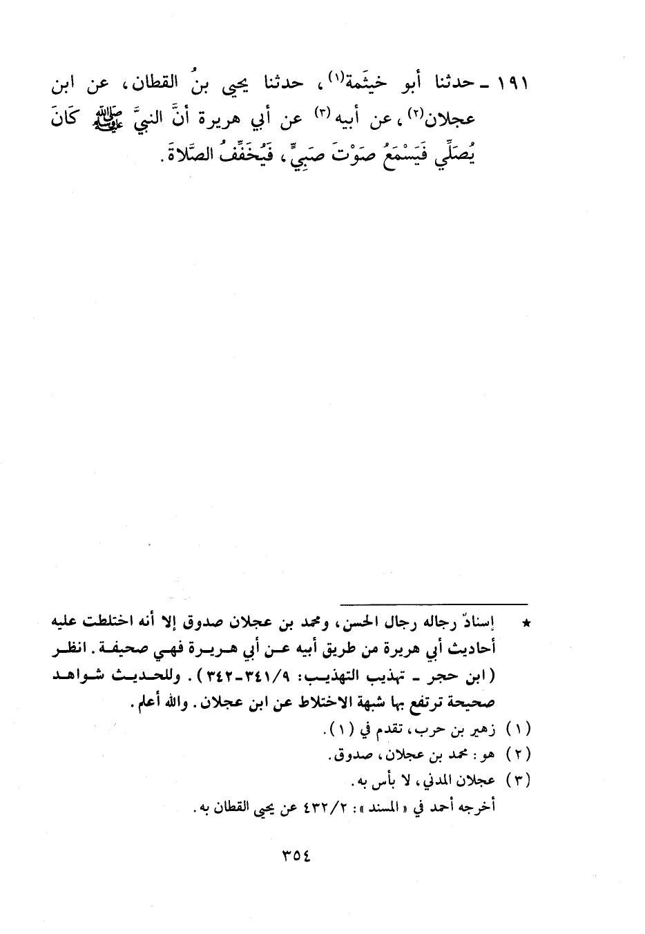 191 - حَدَّثَنَا أَبُو خَيْثَمَةَ، حَدَّثَنَا يَحْيَى بْنُ الْقَطَّانِ، عَنِ ابْنِ عَجْلَانَ، عَنْ أَبِيهِ، عَنْ أَبِي هُرَيْرَةَ، أَنَّ النَّبِيَّ صَلَّى اللهُ عَلَيْهِ وَسَلَّمَ «كَانَ §يُصَلِّي فَيَسْمَعُ صَوْتَ صَبِيٍّ فَيُخَفِّفُ الصَّلَاةَ»