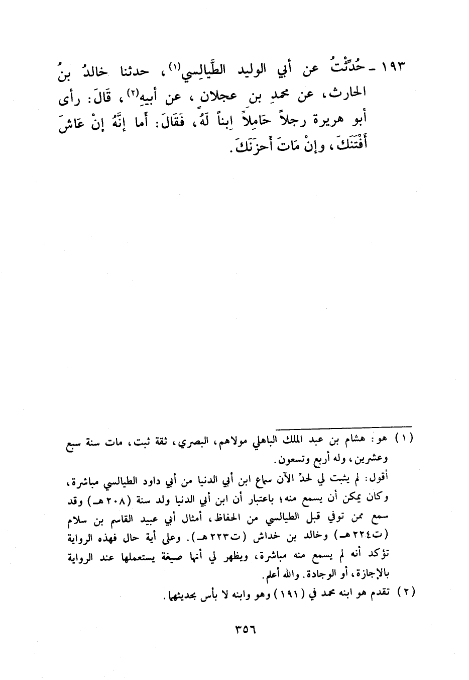 193 - حُدِّثْتُ عَنْ أَبِي الْوَلِيدِ الطَّيَالِسِيِّ، حَدَّثَنَا خَالِدُ بْنُ الْحَارِثِ، عَنْ مُحَمَّدِ بْنِ عَجْلَانَ، عَنْ أَبِيهِ، قَالَ: رَأَى أَبُو هُرَيْرَةَ رَجُلًا حَامِلًا ابْنًا لَهُ فَقَالَ: «أَمَا إِنَّهُ §إِنْ عَاشَ أَفْتَنَكَ وَإِنْ مَاتَ أَحْزَنَكَ»