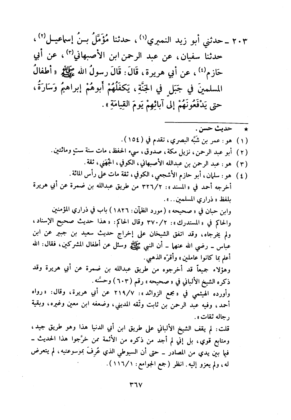 203 - حَدَّثَنِي أَبُو زَيْدٍ النُّمَيْرِيُّ، حَدَّثَنَا مُؤَمَّلُ بْنُ إِسْمَاعِيلَ، حَدَّثَنَا سُفْيَانُ، عَنْ عَبْدِ الرَّحْمَنِ بْنِ الْأَصْبَهَانِيِّ، عَنْ أَبِي حَازِمٍ، عَنْ أَبِي هُرَيْرَةَ، قَالَ: قَالَ رَسُولُ اللَّهِ صَلَّى اللهُ عَلَيْهِ وَسَلَّمَ: «§أَطْفَالُ الْمُسْلِمِينَ فِي جَبَلٍ فِي الْجَنَّةِ يَكْفُلُهُمْ أَبُوهُمْ إِبْرَاهِيمُ وَسَارَةُ حَتَّى يَدْفَعُوهُمْ إِلَى آبَائِهِمْ يَوْمَ الْقِيَامَةِ»