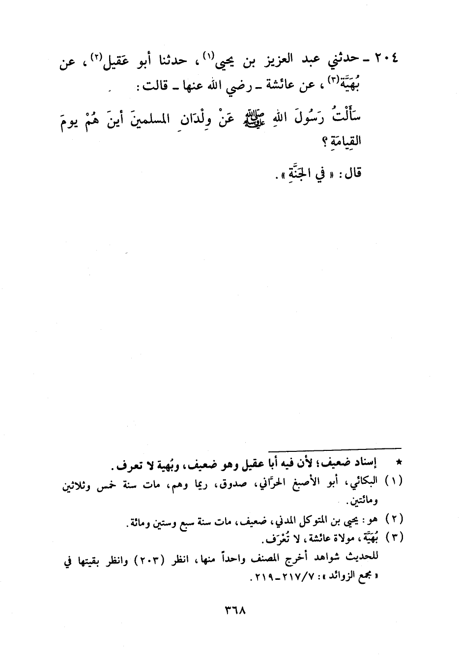 204 - حَدَّثَنِي عَبْدُ الْعَزِيزِ بْنُ يَحْيَى، حَدَّثَنَا أَبُو عَقِيلٍ، عَنْ بُهَيَّةَ، عَنْ عَائِشَةَ، رَضِيَ اللَّهُ عَنْهَا قَالَتْ: سَأَلْتُ رَسُولَ اللَّهِ صَلَّى اللهُ عَلَيْهِ وَسَلَّمَ عَنْ وِلْدَانِ الْمُسْلِمِينَ أَيْنَ هُمْ يَوْمَ الْقِيَامَةِ؟ قَالَ: «§فِي الْجَنَّةِ»