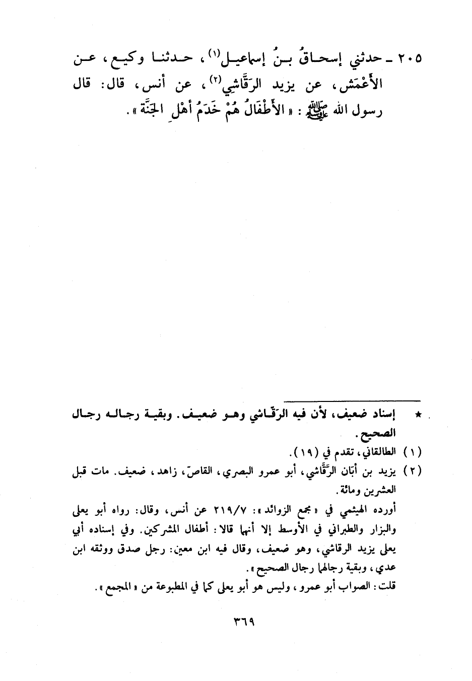 205 - حَدَّثَنِي إِسْحَاقُ بْنُ إِسْمَاعِيلَ، حَدَّثَنَا وَكِيعٌ، عَنِ الْأَعْمَشِ، عَنْ يَزِيدَ الرَّقَاشِيِّ، عَنْ أَنَسٍ، قَالَ: قَالَ رَسُولُ اللَّهِ صَلَّى اللهُ عَلَيْهِ وَسَلَّمَ: «§الْأَطْفَالُ هُمْ خَدَمُ أَهْلِ الْجَنَّةِ»