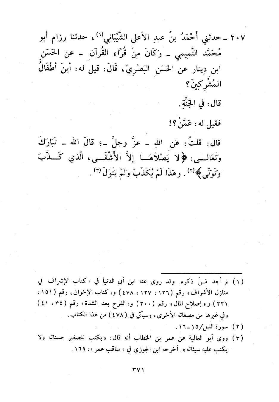 207 - حَدَّثَنِي أَحْمَدُ بْنُ عَبْدِ الْأَعْلَى الشَّيْبَانِيُّ، حَدَّثَنَا رِزَامٌ أَبُو مُحَمَّدٍ التَّمِيمِيُّ وَكَانَ مِنْ قُرَّاءِ الْقُرْآنِ، عَنِ الْحَسَنِ بْنِ دِينَارٍ، عَنِ الْحَسَنِ الْبَصْرِيِّ، قَالَ: قِيلَ لَهُ: أَيْنَ أَطْفَالُ الْمُشْرِكِينَ؟ قَالَ: «§فِي الْجَنَّةِ» ، فَقِيلَ لَهُ: عَمَّنْ؟ قَالَ: " قُلْتُ عَنِ اللَّهِ عَزَّ وَجَلَّ، قَالَ اللَّهُ تَبَارَكَ وَتَعَالَى: {لَا يَصْلَاهَا إِلَّا الْأَشْقَى الَّذِي كَذَّبَ وَتَوَلَّى} [الليل: 16] وَهَذَا لَمْ يَكْذِبْ وَلَمْ يَتَوَلَّ "