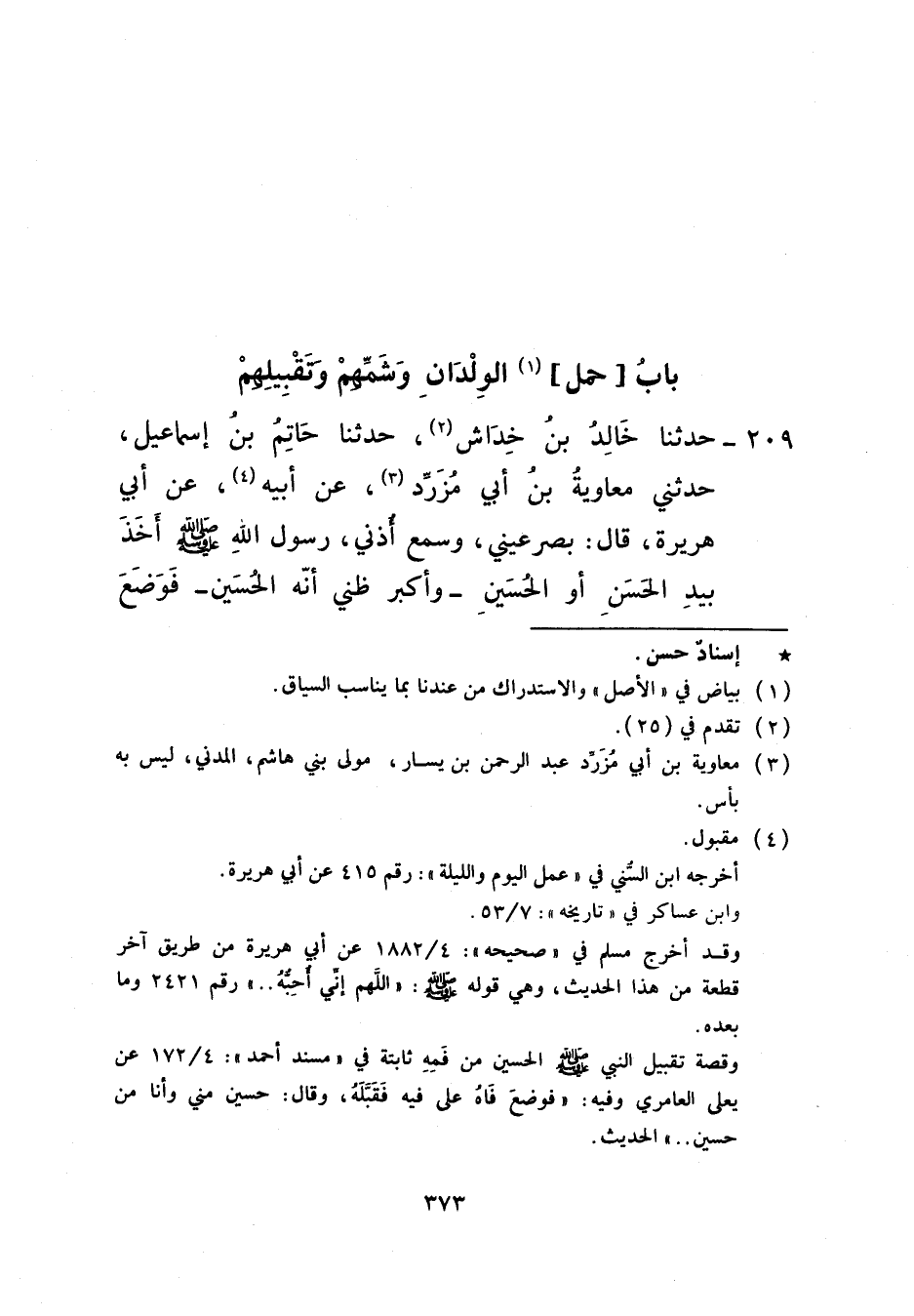 209 - حَدَّثَنَا خَالِدُ بْنُ خِدَاشٍ، حَدَّثَنَا حَاتِمُ بْنُ إِسْمَاعِيلَ، حَدَّثَنِي مُعَاوِيَةُ بْنُ أَبِي مُزَرِّدٍ، عَنْ أَبِيهِ، عَنْ أَبِي هُرَيْرَةَ، قَالَ: بَصُرَ عَيْنِي وَسَمِعَ أُذُنِي رَسُولَ اللَّهِ صَلَّى اللهُ عَلَيْهِ وَسَلَّمَ أَخَذَ بِيَدِ الْحَسَنِ أَوِ الْحُسَيْنِ وَأَكْبَرُ ظَنِّي أَنَّهُ الْحُسَيْنُ فَوَضَعَ قَدَمَيْهِ عَلَى قَدَمَيْهِ ثُمَّ جَعَلَ يَرْقِيهِ عَلَى سَاقَيْهِ وَفَخِذَيْهِ وَهُوَ يَقُولُ: «§تَرَقَّ عَيْنُ بَقَّةٍ» فَلَمَّا وَضَعَ رِجْلَيْهِ عَلَى رَسُولِ اللَّهِ صَلَّى اللهُ عَلَيْهِ وَسَلَّمَ فَتْحَ فَاهُ فَقَبَّلَ جَوْفَهُ ثُمَّ قَالَ: «اللَّهُمَّ إِنِّي أُحِبُّهُ فَأَحِبَّهُ وَأَحِبَّ مَنْ يُحِبُّهُ»