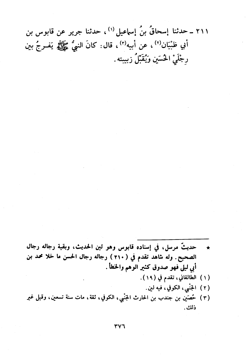 211 - حَدَّثَنَا إِسْحَاقُ بْنُ إِسْمَاعِيلَ، حَدَّثَنَا جَرِيرٌ، عَنْ قَابُوسَ بْنِ أَبِي ظَبْيَانَ، عَنْ أَبِيهِ، قَالَ: «كَانَ النَّبِيُّ صَلَّى اللهُ عَلَيْهِ وَسَلَّمَ §يُفَرِّجُ بَيْنَ رِجْلَيِ الْحُسَيْنِ وَيُقَبِّلُ زَبِيبَتَهُ»