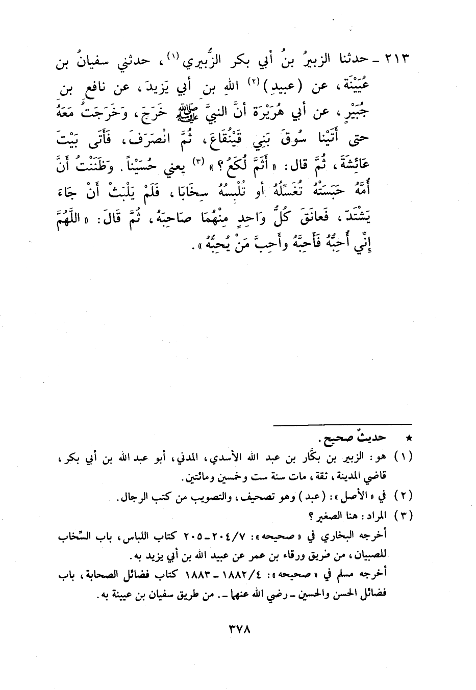 213 - حَدَّثَنَا الزُّبَيْرُ بْنُ أَبِي بَكْرٍ الزُّبَيْرِيُّ، حَدَّثَنِي سُفْيَانُ بْنُ عُيَيْنَةَ، عَنْ عُبَيْدِ اللَّهِ بْنِ أَبِي يَزِيدَ، عَنْ نَافِعِ بْنِ جُبَيْرٍ، عَنْ أَبِي هُرَيْرَةَ، أَنَّ النَّبِيَّ صَلَّى اللهُ عَلَيْهِ وَسَلَّمَ خَرَجَ وَخَرَجْتُ مَعَهُ حَتَّى أَتَيْنَا سُوقَ بَنِي قَيْنُقَاعٍ ثُمَّ انْصَرَفَ فَأَتَى بَيْتَ عَائِشَةَ ثُمَّ قَالَ: أَثَمَّ لُكَعُ - يَعْنِي حُسَيْنًا - وَظَنَنْتُ أَنَّ أُمَّهُ حَبَسَتْهُ تَغْسِلُهُ أَوْ تُلْبِسُهُ سِخَابًا فَلَمْ يَلْبَثْ أَنْ جَاءَ يَشْتَدُّ فَعَانَقَ كُلُّ وَاحِدٍ مِنْهُمَا صَاحِبَهُ ثُمَّ قَالَ: «اللَّهُمَّ إِنِّي §أُحِبُّهُ فَأَحِبَّهُ وَأَحِبَّ مَنْ يُحِبُّهُ»