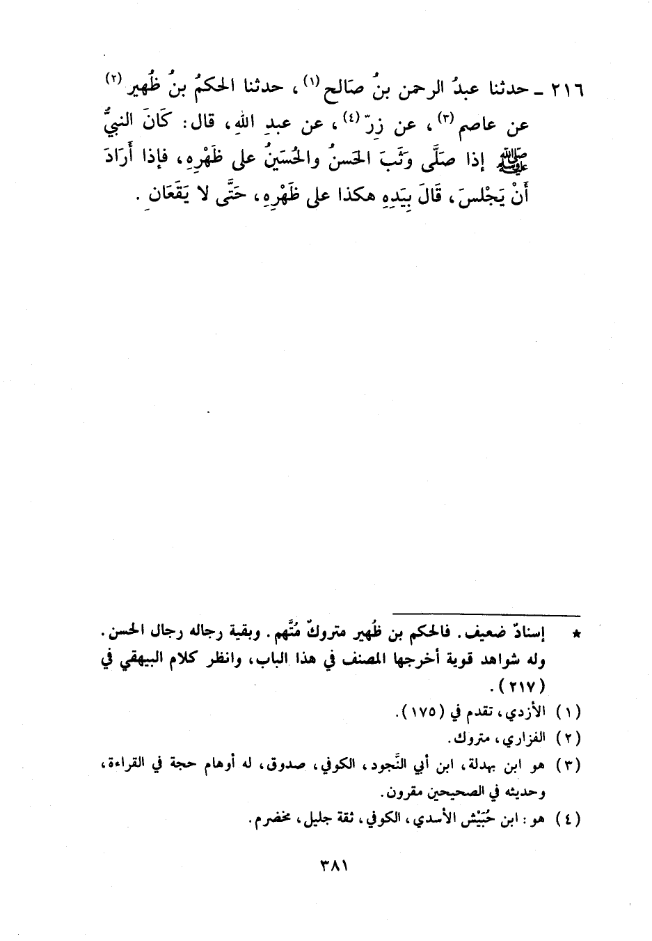 216 - حَدَّثَنَا عَبْدُ الرَّحْمَنِ بْنُ صَالِحٍ، حَدَّثَنَا الْحَكَمُ بْنُ ظُهَيْرٍ، عَنْ عَاصِمٍ، عَنْ زِرٍّ، عَنْ عَبْدِ اللَّهِ، قَالَ: «كَانَ النَّبِيُّ صَلَّى اللهُ عَلَيْهِ وَسَلَّمَ إِذَا صَلَّى §وَثَبَ الْحَسَنُ وَالْحُسَيْنُ عَلَى ظَهْرِهِ فَإِذَا أَرَادَ أَنْ يَجْلِسَ قَالَ بِيَدِهِ هَكَذَا عَلَى ظَهْرِهِ حَتَّى لَا يَقَعَانِ»