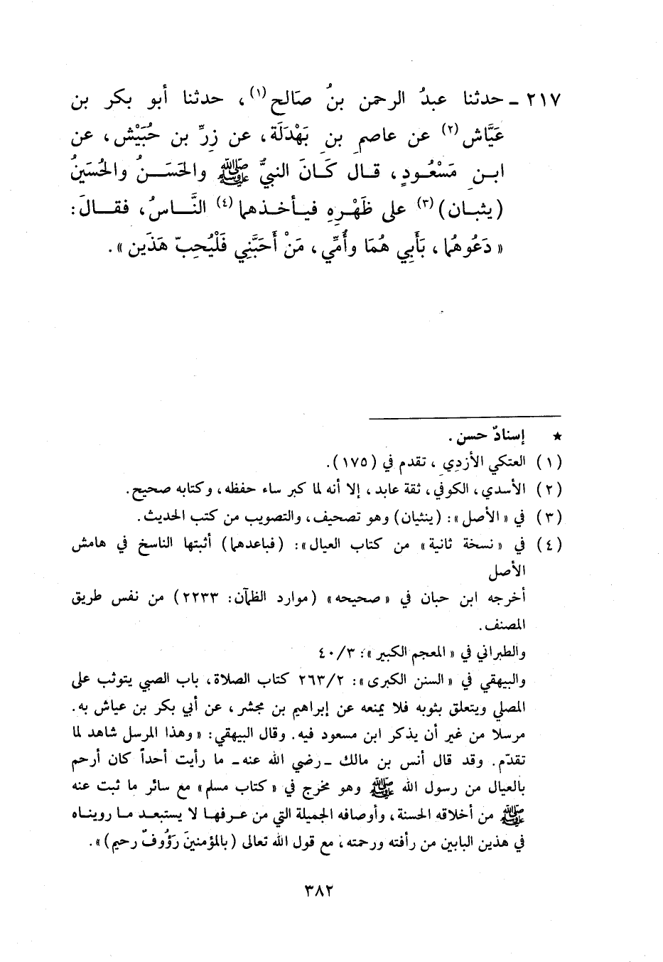 217 - حَدَّثَنَا عَبْدُ الرَّحْمَنِ بْنُ صَالِحٍ، حَدَّثَنَا أَبُو بَكْرِ بْنُ عَيَّاشٍ، عَنْ عَاصِمِ بْنِ بَهْدَلَةَ، عَنْ زِرِّ بْنِ حُبَيْشٍ، عَنِ ابْنِ مَسْعُودٍ، قَالَ: كَانَ النَّبِيُّ صَلَّى اللهُ عَلَيْهِ وَسَلَّمَ وَالْحَسَنُ وَالْحُسَيْنُ يَثِبَانِ عَلَى ظَهْرِهِ فَيَأْخُذُهُمَا النَّاسُ فَقَالَ: «§دَعُوهُمَا بِأَبِي هُمَا وَأُمِّي، مَنْ أَحَبَّنِي فَلْيُحِبَّ هَذَيْنِ»
