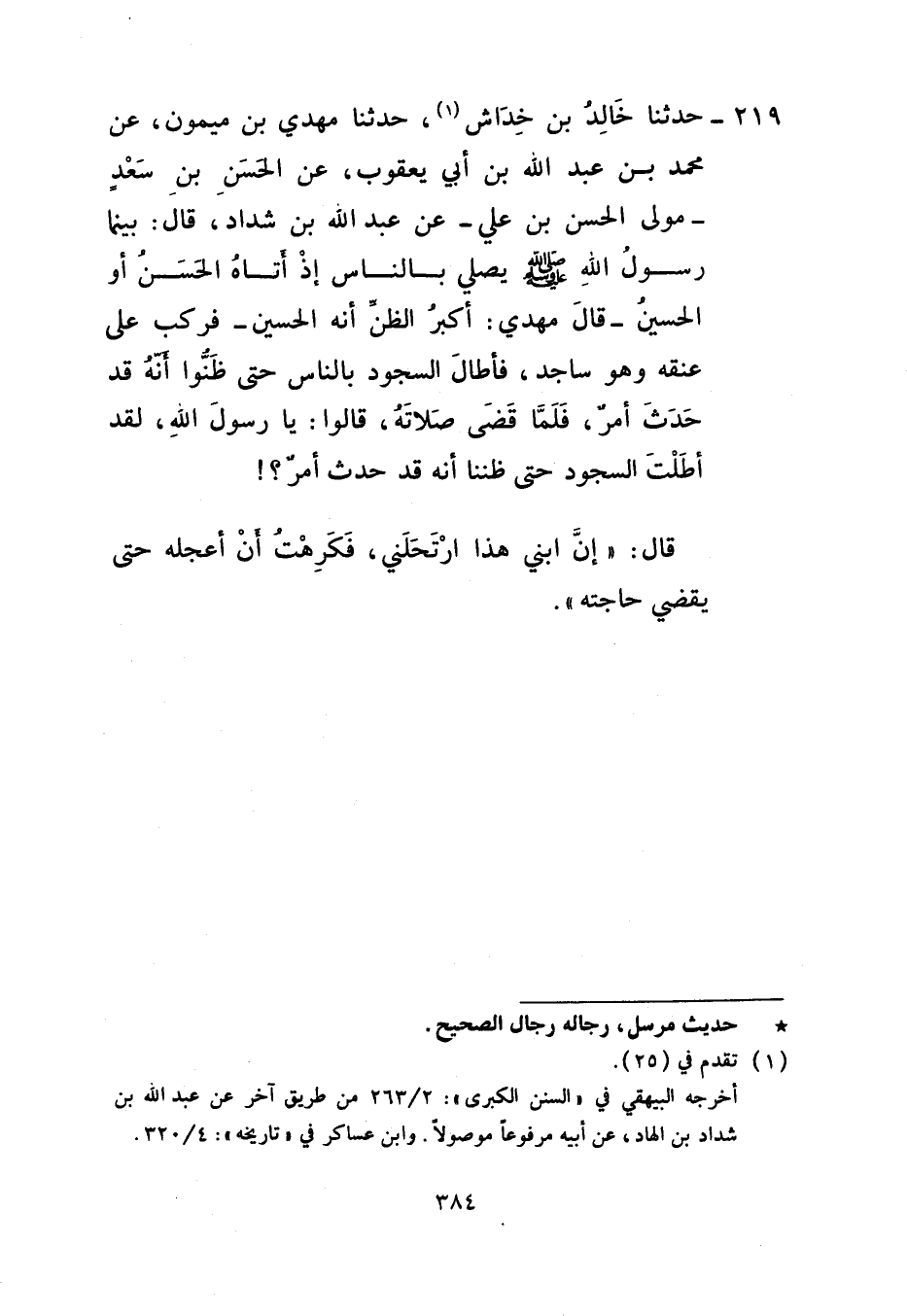 219 - حَدَّثَنَا خَالِدُ بْنُ خِدَاشٍ، حَدَّثَنَا مَهْدِيُّ بْنُ مَيْمُونٍ، عَنْ مُحَمَّدِ بْنِ عَبْدِ اللَّهِ بْنِ أَبِي يَعْقُوبَ، عَنِ الْحَسَنِ بْنِ سَعْدٍ مَوْلَى الْحَسَنِ بْنِ عَلِيٍّ، عَنْ عَبْدِ اللَّهِ بْنِ شَدَّادٍ، قَالَ: بَيْنَمَا رَسُولُ اللَّهِ صَلَّى اللهُ عَلَيْهِ وَسَلَّمَ يُصَلِّي بِالنَّاسِ إِذْ أَتَاهُ الْحَسَنُ أَوِ الْحُسَيْنُ قَالَ الْمَهْدِيُّ: أَكْبَرُ الظَّنِّ أَنَّهُ الْحُسَيْنُ فَرَكِبَ عَلَى عُنُقِهِ وَهُوَ سَاجِدٌ فَأَطَالَ السُّجُودَ بِالنَّاسِ حَتَّى ظَنُّوا أَنَّهُ قَدْ حَدَثَ أَمْرٌ فَلَمَّا قَضَى صَلَاتَهُ قَالُوا: يَا رَسُولَ اللَّهِ، لَقَدْ أَطَلْتَ السُّجُودَ حَتَّى ظَنَنَّا أَنَّهُ قَدْ حَدَثَ أَمْرٌ قَالَ: «إِنَّ ابْنِي هَذَا §ارْتَحَلَنِي فَكَرِهْتُ أَنْ أُعَجِّلَهُ حَتَّى يَقْضِيَ حَاجَتَهُ»