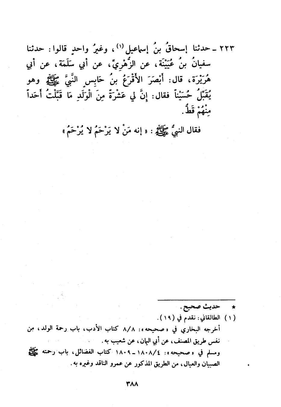 223 - حَدَّثَنَا إِسْحَاقُ بْنُ إِسْمَاعِيلَ، وَغَيْرُ وَاحِدٍ، قَالُوا حَدَّثَنَا سُفْيَانُ بْنُ عُيَيْنَةَ، عَنِ الزُّهْرِيِّ، عَنْ أَبِي سَلَمَةَ، عَنْ أَبِي هُرَيْرَةَ، قَالَ: أَبْصَرَ الْأَقْرَعُ بْنُ حَابِسٍ النَّبِيَّ صَلَّى اللهُ عَلَيْهِ وَسَلَّمَ وَهُوَ يُقَبِّلُ حُسَيْنًا فَقَالَ: إِنَّ لِي عَشَرَةً مِنَ الْوَلَدِ مَا قَبَّلْتُ أَحَدًا مِنْهُمْ قَطُّ فَقَالَ النَّبِيُّ صَلَّى اللهُ عَلَيْهِ وَسَلَّمَ: «إِنَّهُ §مَنْ لَا يَرْحَمُ لَا يُرْحَمُ»