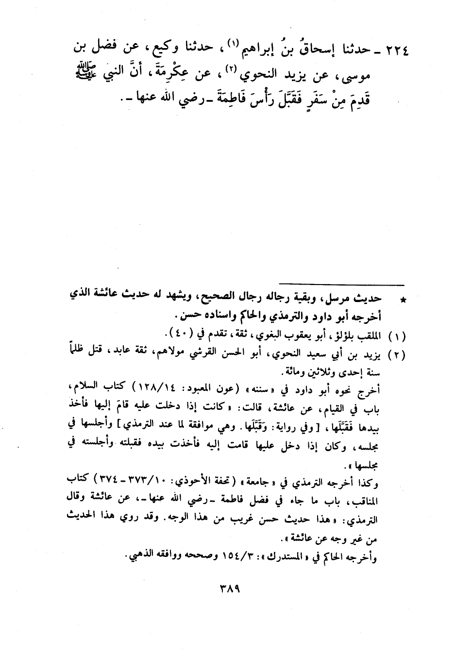 224 - حَدَّثَنَا إِسْحَاقُ بْنُ إِبْرَاهِيمَ، حَدَّثَنَا وَكِيعٌ، عَنْ فَضْلِ بْنِ مُوسَى، عَنْ يَزِيدَ النَّحْوِيِّ، عَنْ عِكْرِمَةَ، أَنَّ النَّبِيَّ صَلَّى اللهُ عَلَيْهِ وَسَلَّمَ «§قَدِمَ مِنْ سَفَرٍ فَقَبَّلَ رَأْسَ فَاطِمَةَ رَضِيَ اللَّهُ عَنْهَا»