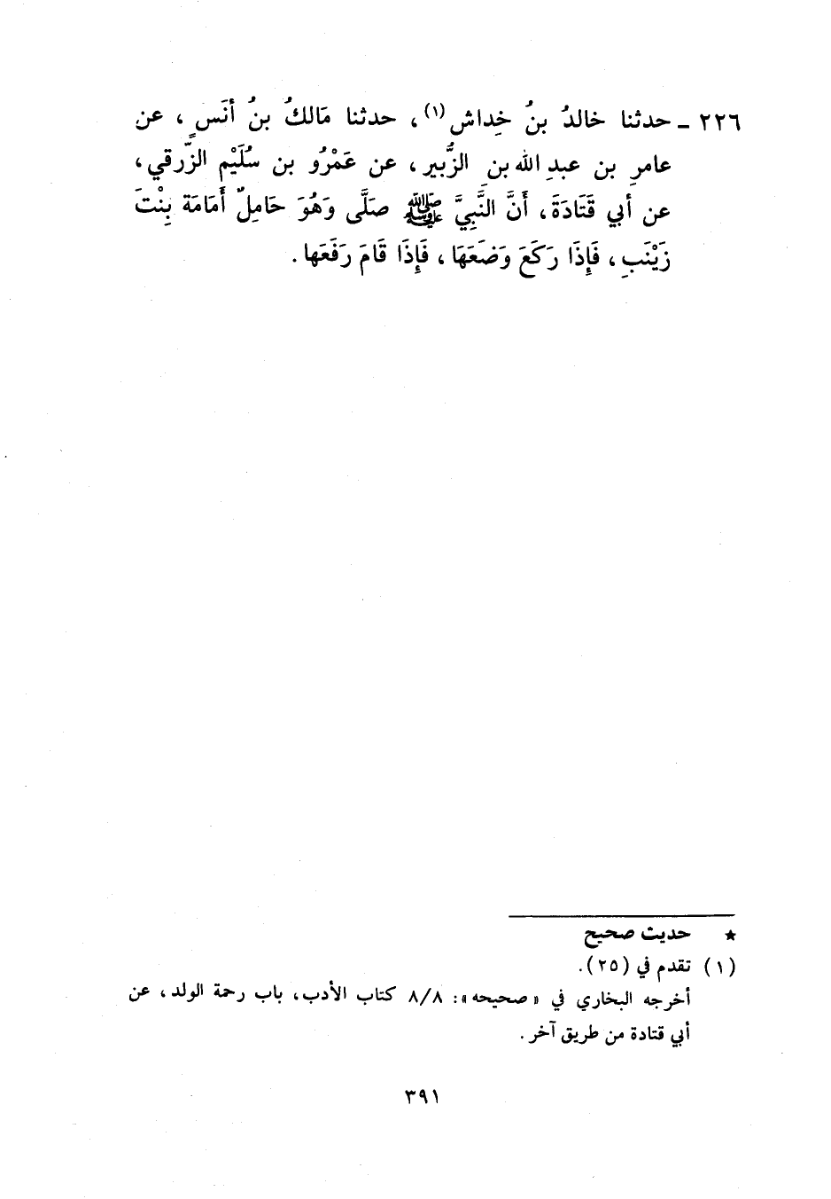 226 - حَدَّثَنَا خَالِدُ بْنُ خِدَاشٍ، حَدَّثَنَا مَالِكُ بْنُ أَنَسٍ، عَنْ عَامِرِ بْنِ عَبْدِ اللَّهِ بْنِ الزُّبَيْرِ، عَنْ عَمْرِو بْنِ سُلَيْمٍ الزُّرَقِيِّ، عَنْ أَبِي قَتَادَةَ، أَنَّ النَّبِيَّ صَلَّى اللهُ عَلَيْهِ وَسَلَّمَ §صَلَّى وَهُوَ حَامِلٌ أُمَامَةَ بِنْتَ زَيْنَبَ فَإِذَا رَكَعَ وَضَعَهَا فَإِذَا قَامَ رَفَعَهَا