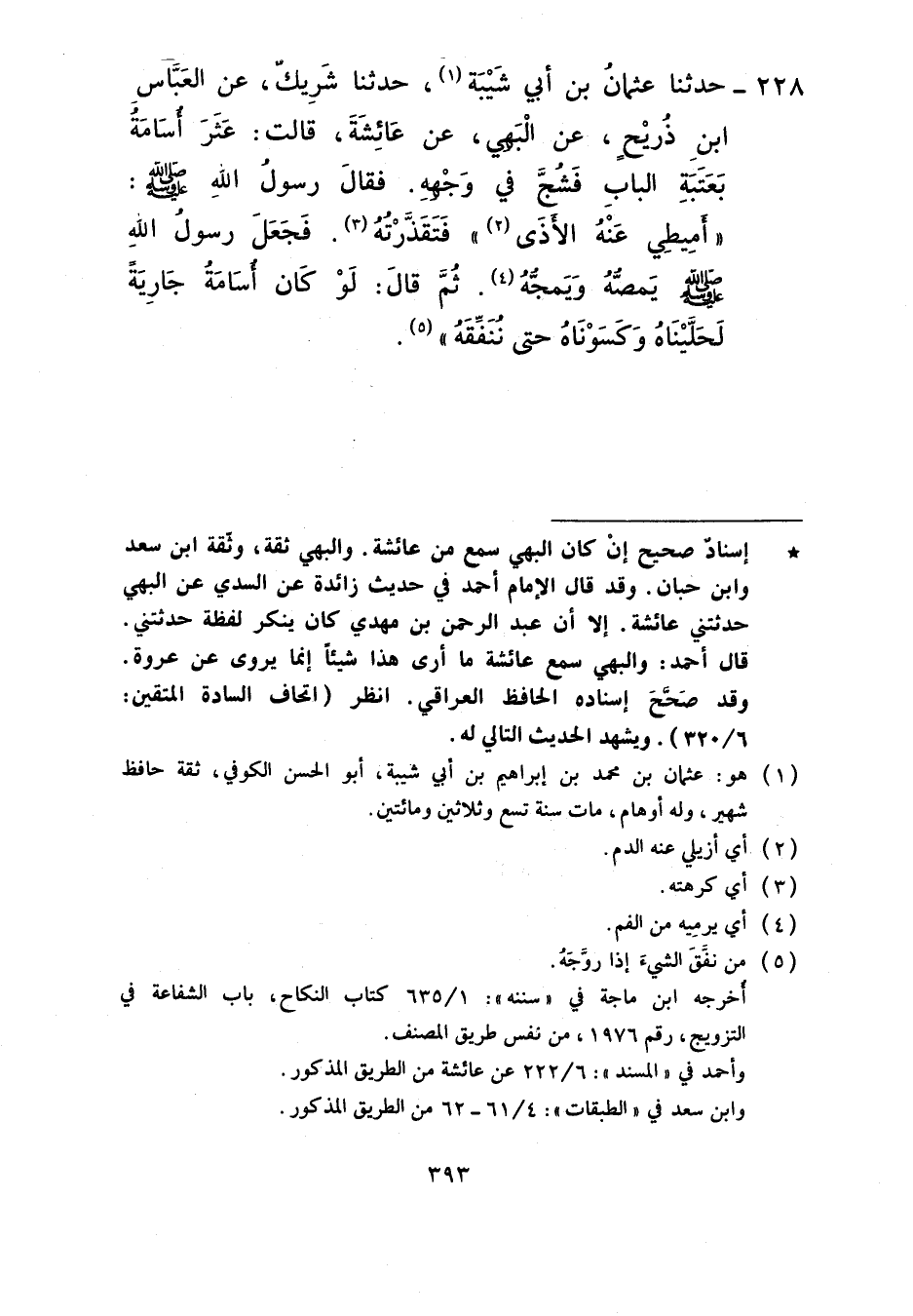 228 - حَدَّثَنَا عُثْمَانُ بْنُ أَبِي شَيْبَةَ، حَدَّثَنَا شَرِيكٌ، عَنِ الْعَبَّاسِ بْنِ ذَرِيحٍ، عَنِ الْبَهِيِّ، عَنْ عَائِشَةَ، قَالَتْ: عَثَرَ أُسَامَةُ بِعَتَبَةِ الْبَابِ فَشُجَّ فِي وَجْهِهِ فَقَالَ رَسُولُ اللَّهِ صَلَّى اللهُ عَلَيْهِ وَسَلَّمَ: «أَمِيطِي عَنْهُ الْأَذَى» فَتَقَذَّرْتُهُ فَجَعَلَ رَسُولُ اللَّهِ صَلَّى اللهُ عَلَيْهِ وَسَلَّمَ يَمُصُّهُ وَيَمُجُّهُ ثُمَّ قَالَ: «§لَوْ كَانَ أُسَامَةُ جَارِيَةً لَحَلَّيْنَاهُ وَكَسَوْنَاهُ حَتَّى تُنَفِّقَهُ»