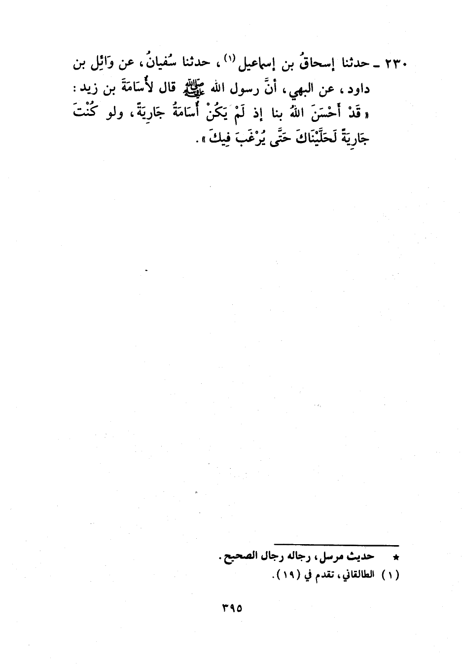 230 - حَدَّثَنَا إِسْحَاقُ بْنُ إِسْمَاعِيلَ، حَدَّثَنَا سُفْيَانُ، عَنْ وَائِلِ بْنِ دَاوُدَ، عَنِ الْبَهِيِّ، أَنَّ رَسُولَ اللَّهِ صَلَّى اللهُ عَلَيْهِ وَسَلَّمَ قَالَ لِأُسَامَةَ بْنِ زَيْدٍ: «قَدْ §أَحْسَنَ اللَّهُ بِنَا إِذْ لَمْ يَكُنْ أُسَامَةُ جَارِيَةً، وَلَوْ كُنْتَ جَارِيَةً لَحَلَّيْنَاكَ حَتَّى يُرْغَبَ فِيكَ»