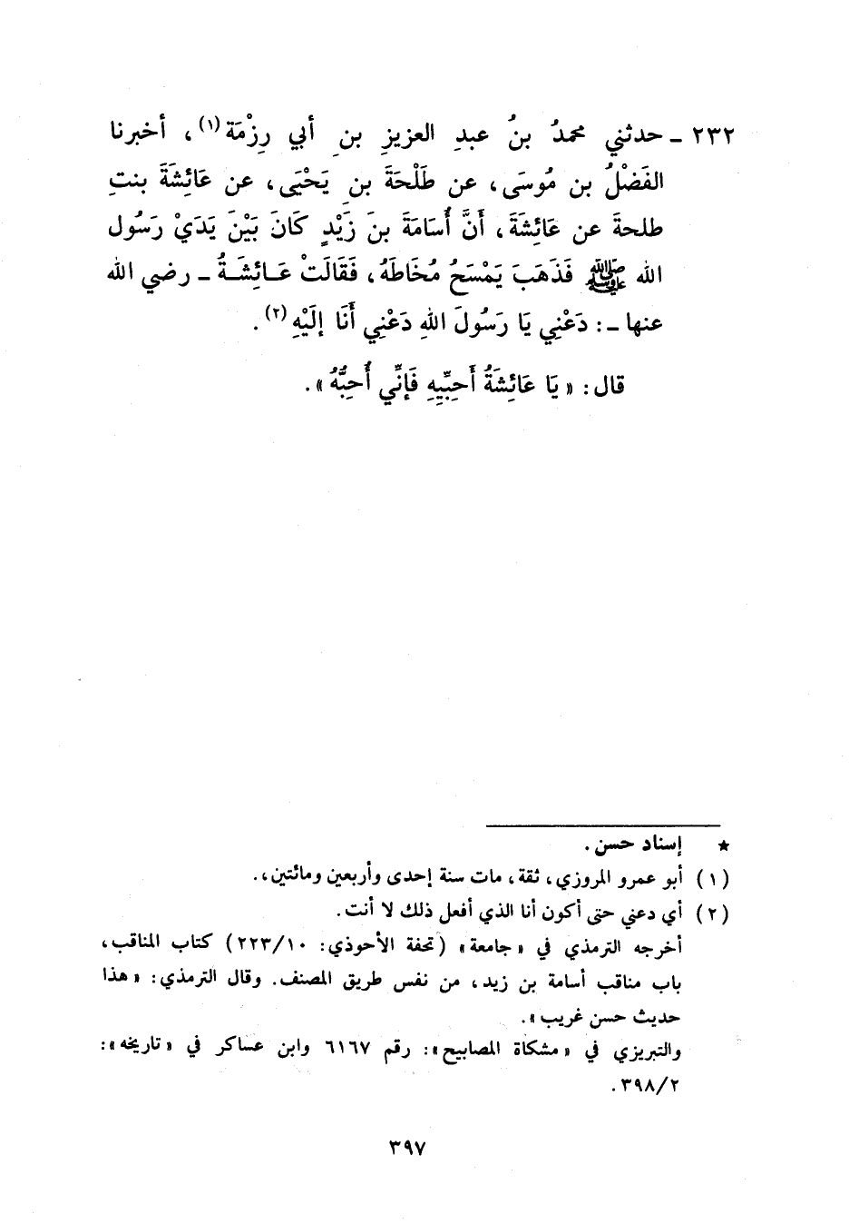 232 - حَدَّثَنِي مُحَمَّدُ بْنُ عَبْدِ الْعَزِيزِ بْنِ أَبِي رِزْمَةَ، أَخْبَرَنَا الْفَضْلُ بْنُ مُوسَى، عَنْ طَلْحَةَ بْنِ يَحْيَى، عَنْ عَائِشَةَ بِنْتِ طَلْحَةَ، عَنْ عَائِشَةَ، أَنَّ أُسَامَةَ بْنَ زَيْدٍ، كَانَ بَيْنَ يَدَيْ رَسُولِ اللَّهِ صَلَّى اللهُ عَلَيْهِ وَسَلَّمَ فَذَهَبَ يَمْسَحُ مُخَاطَهُ فَقَالَتْ عَائِشَةُ رَضِيَ اللَّهُ عَنْهَا: دَعْنِي يَا رَسُولَ اللَّهِ، دَعْنِي أَنَا إِلَيْهُ قَالَ: «يَا عَائِشَةُ §أَحِبِّيهِ فَإِنِّي أُحِبُّهُ»