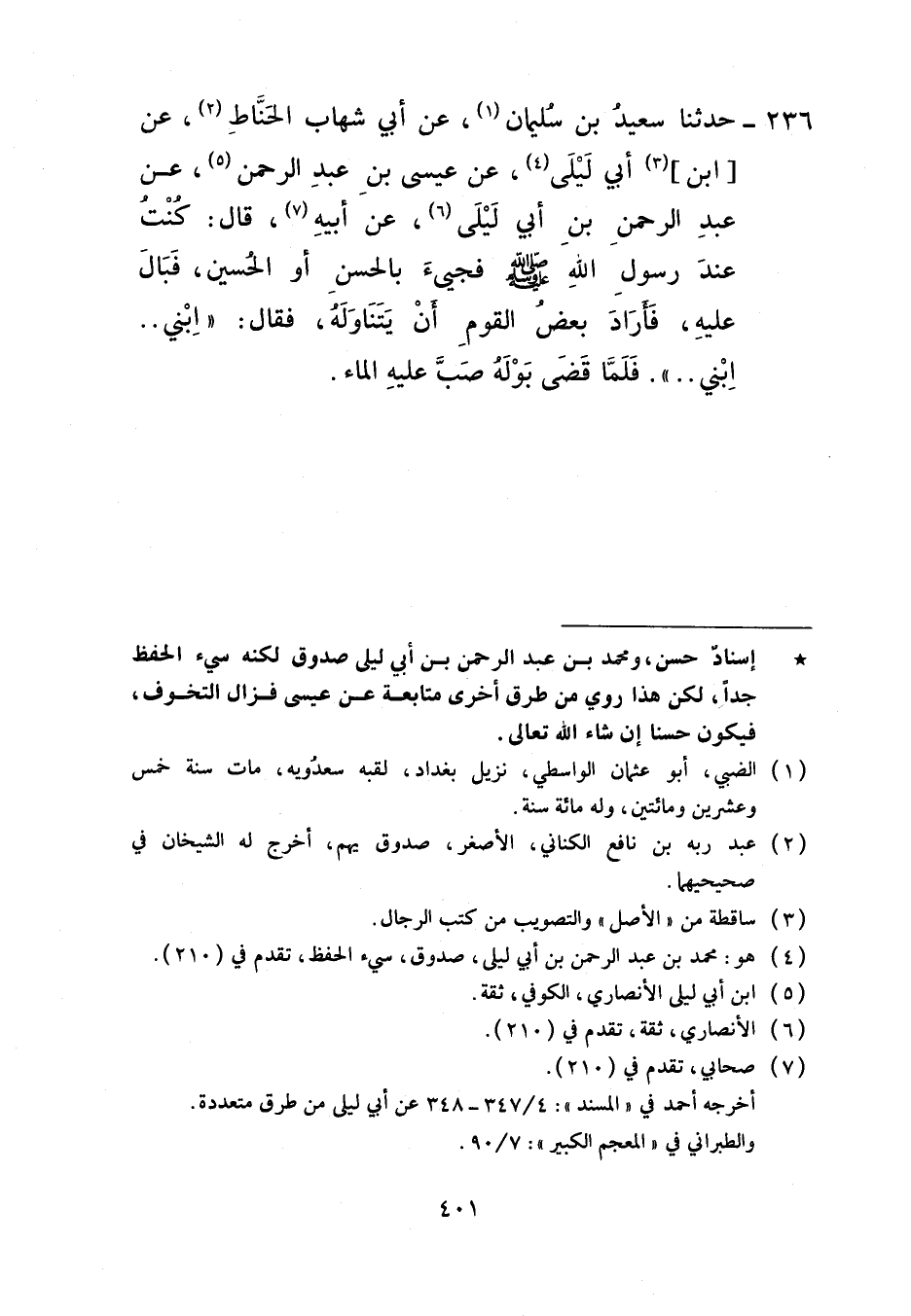 236 - حَدَّثَنَا سَعِيدُ بْنُ سُلَيْمَانَ، عَنْ أَبِي شِهَابٍ الْحَنَّاطِ، عَنِ ابْنِ أَبِي لَيْلَى، عَنْ عِيسَى بْنِ عَبْدِ الرَّحْمَنِ، عَنْ عَبْدِ الرَّحْمَنِ بْنِ أَبِي لَيْلَى، عَنْ أَبِيهِ، قَالَ: كُنْتُ عِنْدَ رَسُولِ اللَّهِ صَلَّى اللهُ عَلَيْهِ وَسَلَّمَ فَجِيئَ بِالْحَسَنِ أَوِ الْحُسَيْنِ فَبَالَ عَلَيْهِ فَأَرَادَ بَعْضُ الْقَوْمِ أَنْ يَتَنَاوَلَهُ فَقَالَ: «§ابْنِي ابْنِي» فَلَمَّا قَضَى بَوْلَهُ صَبَّ عَلَيْهِ الْمَاءَ